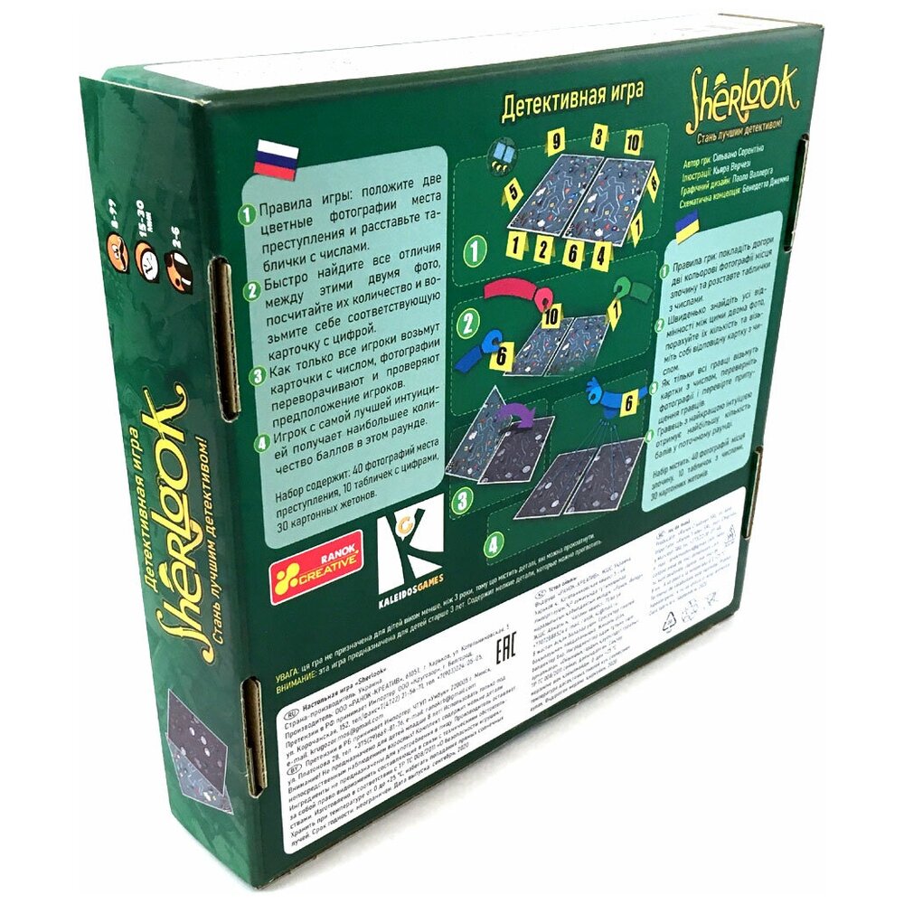 Авторская детективная игра «Sherlook» – это игра, где можно проявить свои дедуктивные способности, внимательность и логическое мышление, ища доказательства преступления! Проведите 10 расследований и станьте лучшим сыщиком. Цель игры: заметить все различия на двух фотографиях. Победителем становится тот, кто нашел их больше. Правила игры очень просты, поэтому играть будет интересно как взрослым, так и детям. Игра идеальна для вечеринок, домашних и дружеских посиделок.