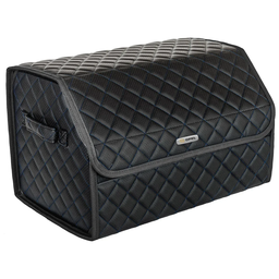 Сумка-органайзер в багажник автомобиля из перфорированной экокожи черная с синей нитью ViceCar c логотипом OPEL (темно-серый кант)