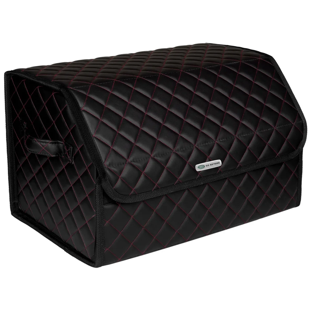 Сумка-органайзер в багажник автомобиля из экокожи черная с красной нитью ViceCar с логотипом LAND ROVER (черный кант)