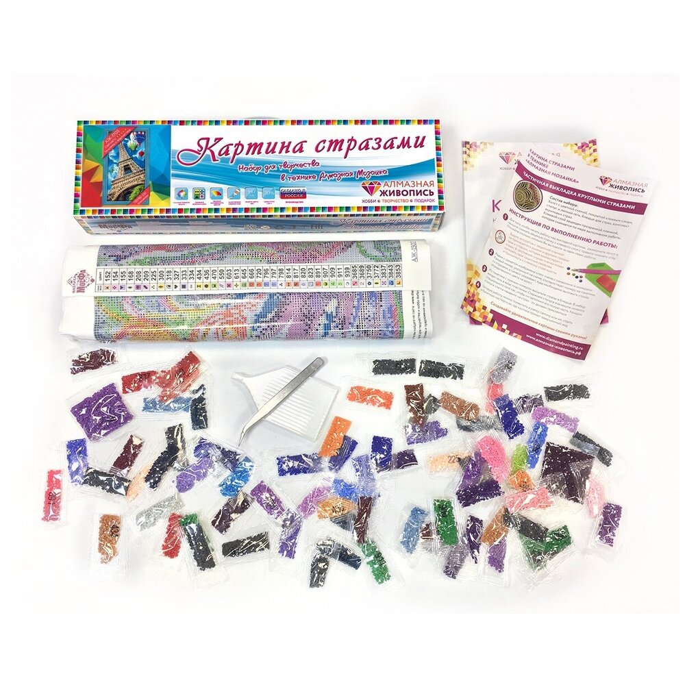 Элементы мозаики представляют собой акриловые стразы размером 2,5 х 2,5 мм. Поверхность страз имеет 9 граней, которые очень эффектно отражают свет. Состав набора: Холст с цветной схемой и клеевой основой Пинцет или стилус Лоток для страз Комплект квадратных страз<br />Инструкция по работе. Размер готовой работы, см: 30х60. Число цветов, шт: 42. Уровень сложности набора: 5*. Тип страз: квадратные. Тип выкладки: полная.<br />Все, что нужно — уже в коробке. Просто выберите любимый сюжет и приступай-те к творчеству!.