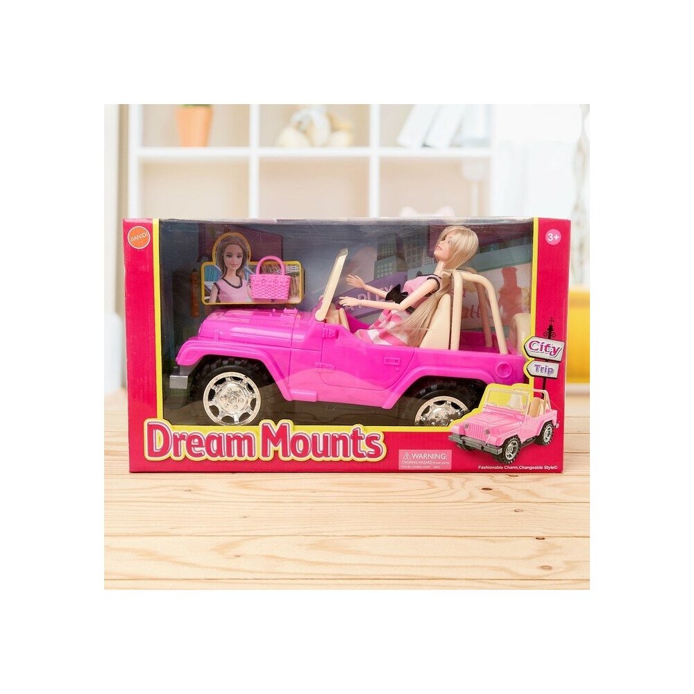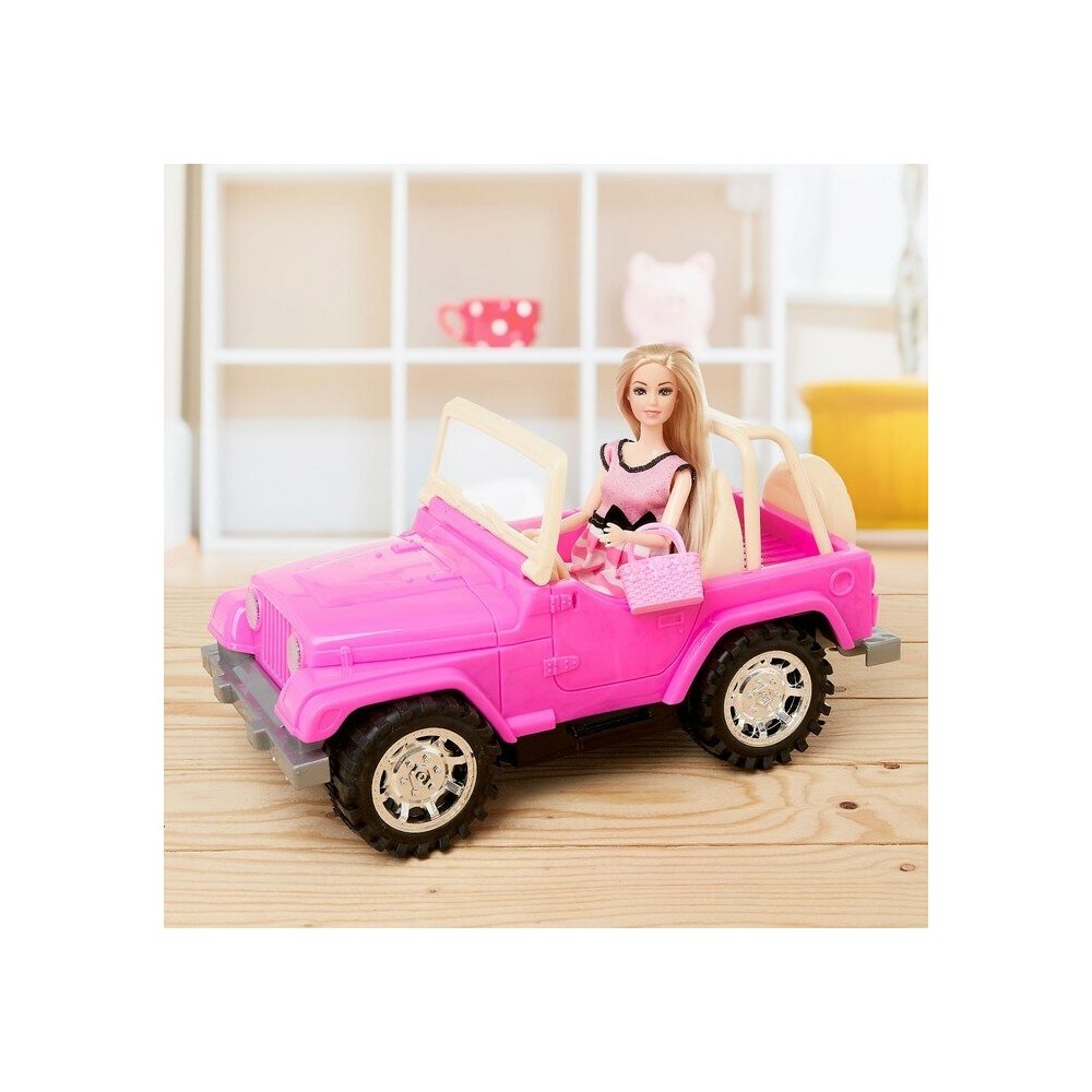 Размеры: кукла шарнирная — 7 × 3,5 × 29 см; джип — 37 × 20 × 20 см; сумочка — 4 × 1,3 × 4,5 см.