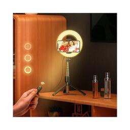 LV03 Showfull держатель для стримов с кольцевой лампой для телефонов 4.7-6.5 дюймов, с круглой подсветкой и BT пультом управления 1. Материал: ABS + алюминиевый сплав. Вес: 280г. 2. Размер: 161*184*70мм. В разложенном виде: 92см. 3. Лампа подсветки: 6 дюймов / внешний диаметр 160.5 мм, 56 лампочек, цветовая температура 3000–6500К. Режим: теплый свет / холодный свет / холодный теплый свет, десять уровней затемнения. Встроенная батарея 1200мАч, время использования 2-8 часов, время зарядки 180 минут. 4. Поддержка мобильных телефонов: 4,7-6,5 дюйма (размер зажима 60-95 мм). 5. Поддерживает дистанционное управление по Bluetooth (Bluetooth 4.0), может делать дистанционное селфи. 6. Маленький и удобный для переноски, прямая трансляция и селфи.