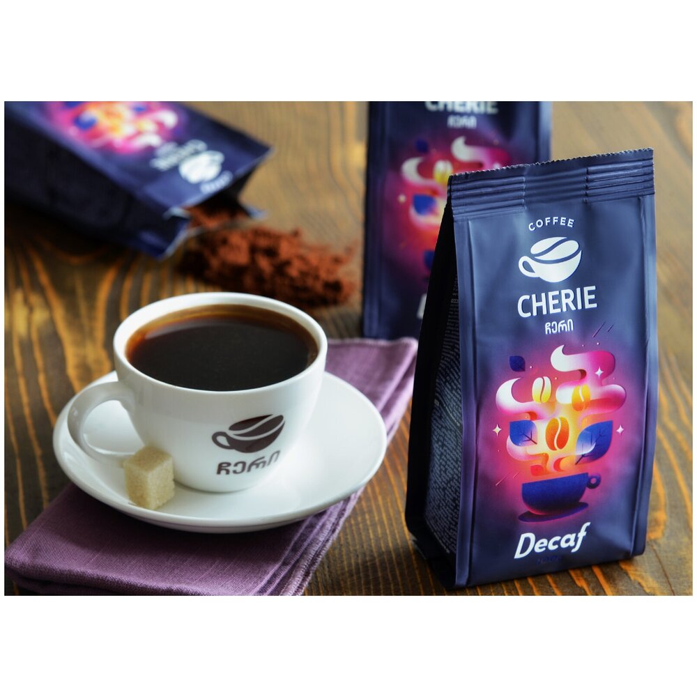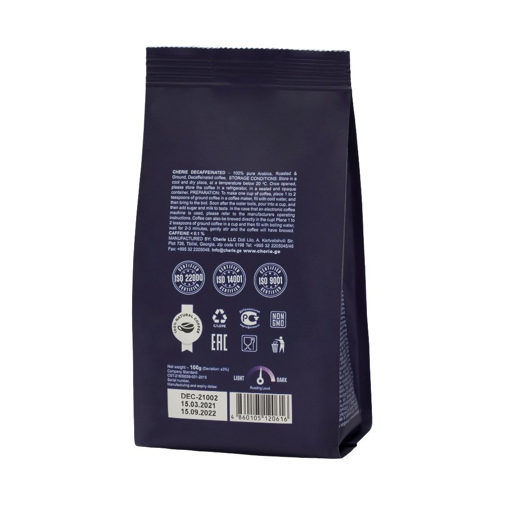 Натуральный обжаренный и молотый, декофеинизированный кофе 100%-ой Арабики. Декофеинизация зеленых зерен кофе происходит до их обжарки. Обычно Арабика содержит 1-1,5% кофеина, а Робуста – приблизительно 2-2,5%. Существуют различные методы декофеинизирования кофе. В Европе, для того чтобы кофе назывался декофеинизированным, допускается содержание в нем максимум 0.1% кофеина. (В 1-ой коробке 6 пачек, по 100 гр. Каждая)