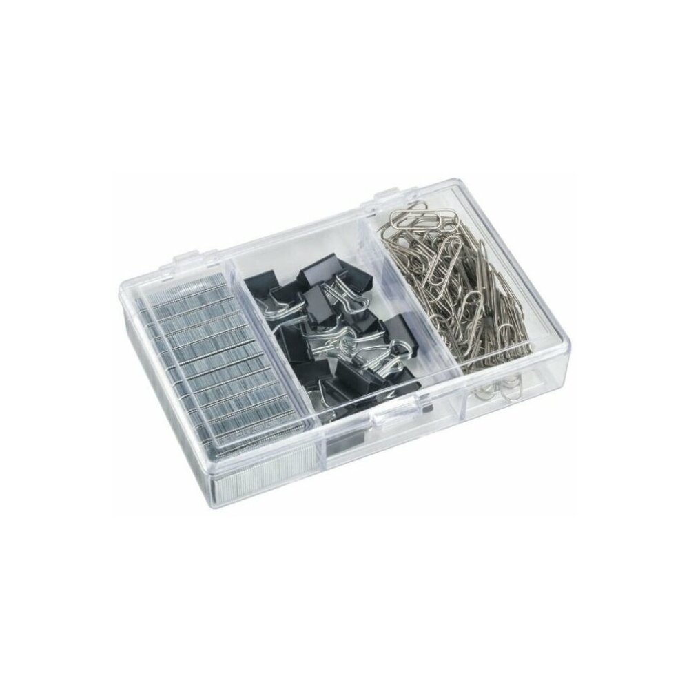 Набор канцеляркий из 3-х предметов ( скрепки 28мм никелированные-70 шт, зажимы для бумаг 15мм-15 шт, скобы для степлера №24/6-1200шт.).
