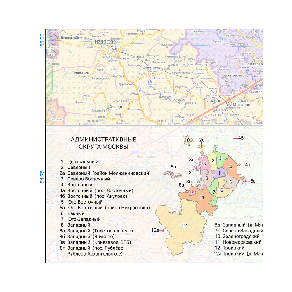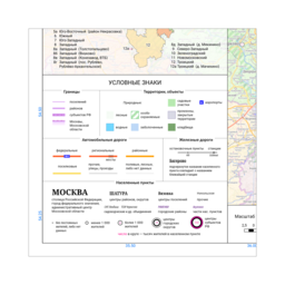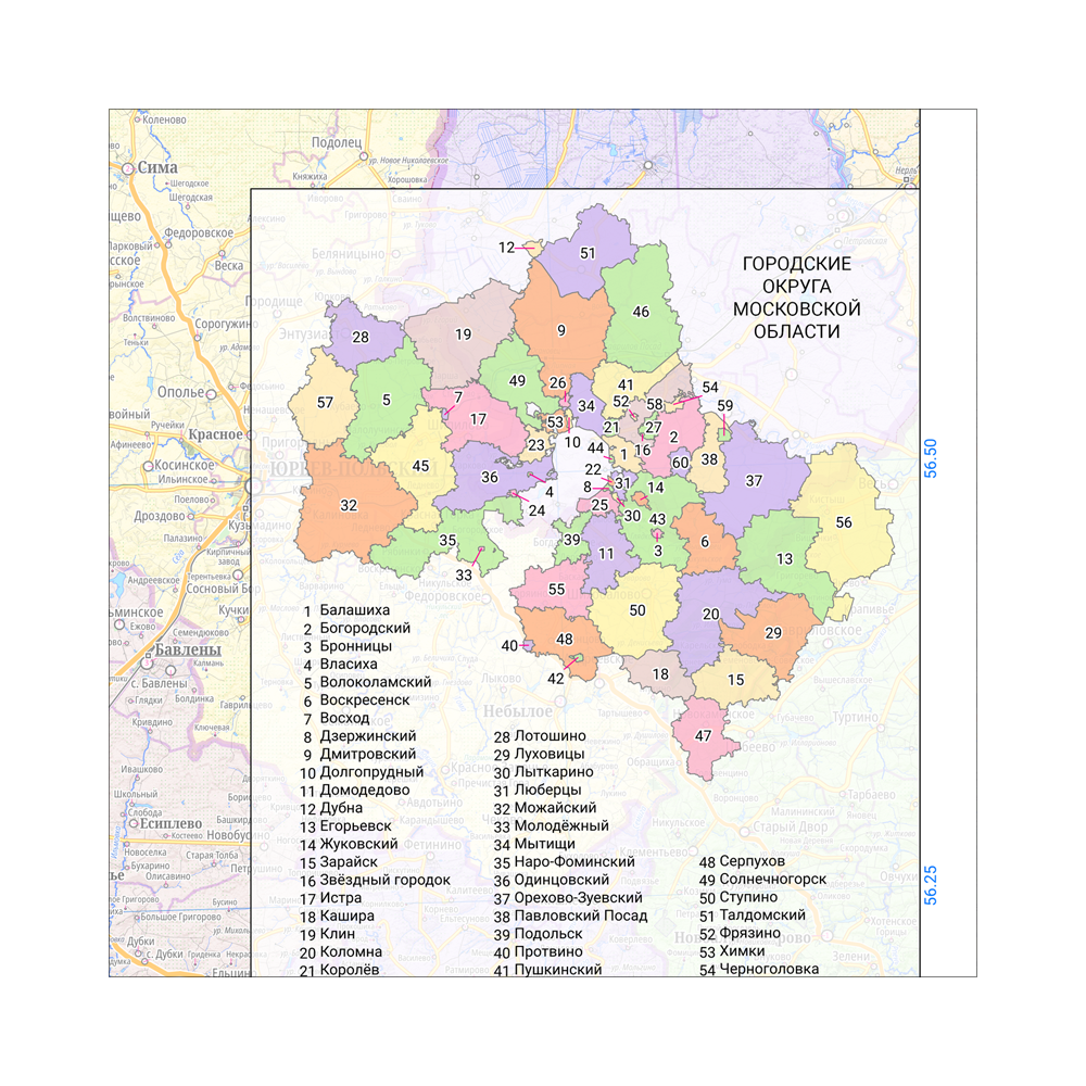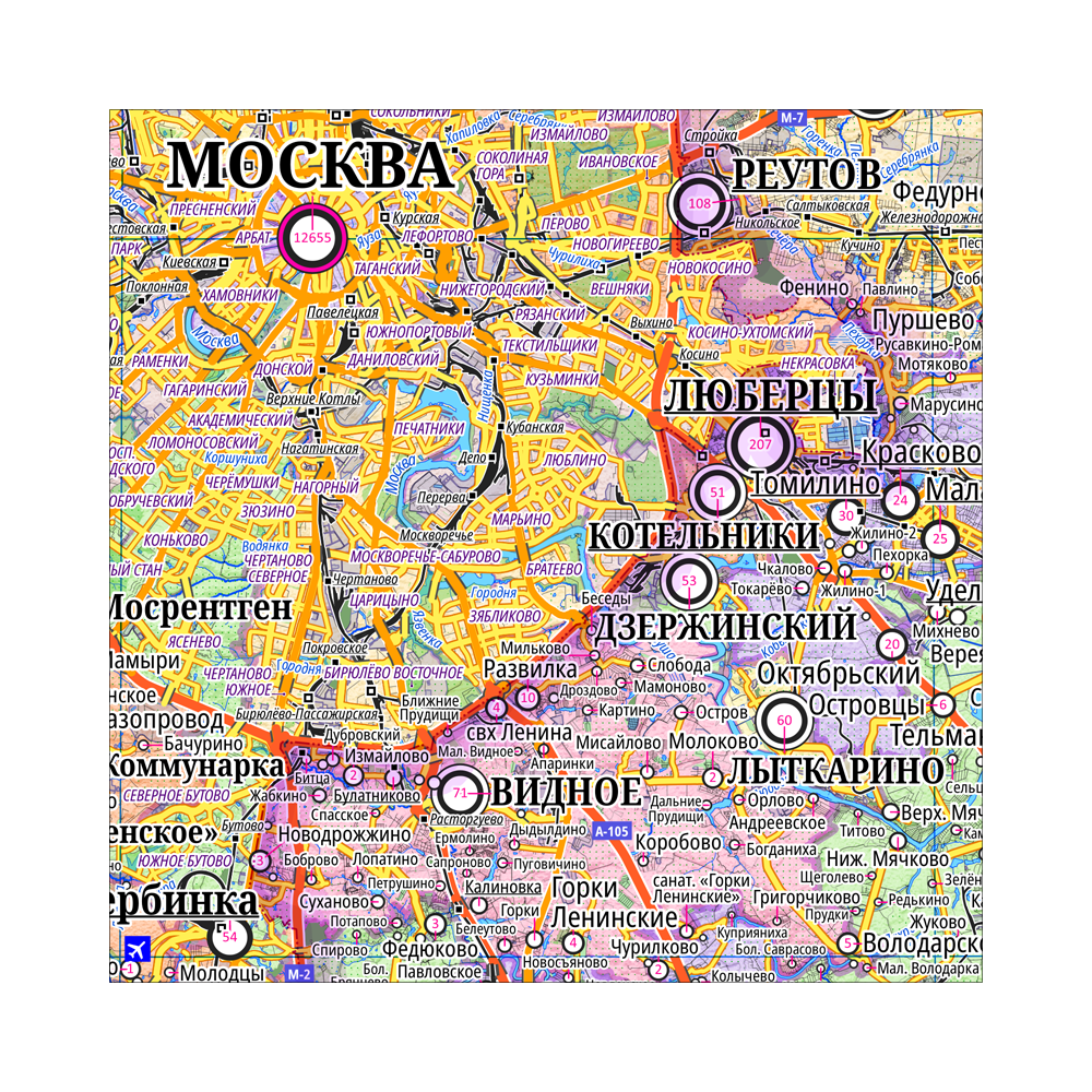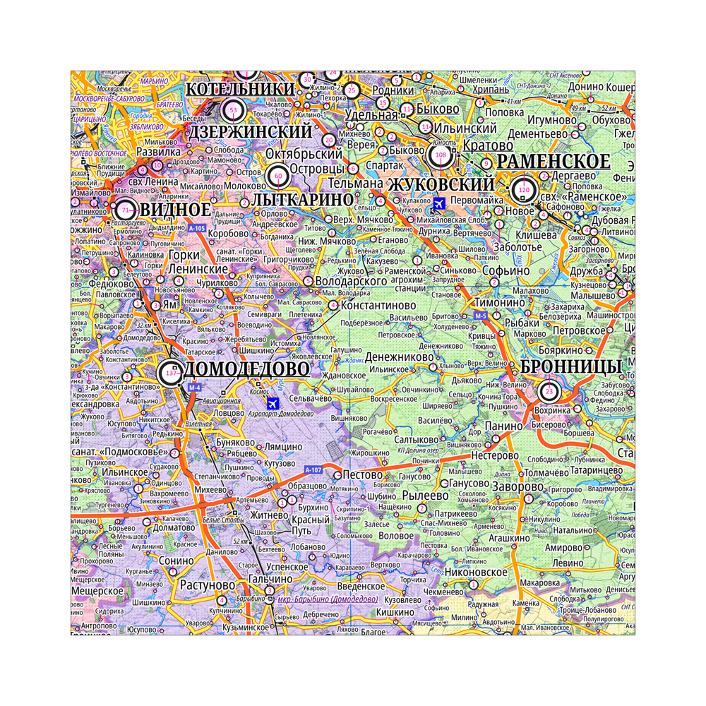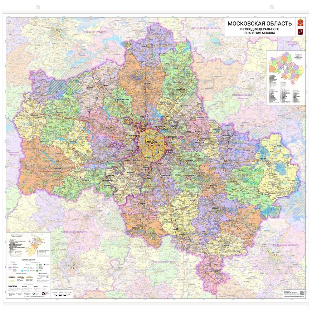 Карта отображает современное (июнь 2021 г.) административно-территориальное устройство Московской области и Москвы: все населенные пункты автомобильные, железные дороги и станции, аэропорты административное устройство Московской области и Москвы лесные, водные объекты, особо охраняемые природные территории число жителей в населенных пунктах свыше 1 тыс. чел. координатная сетка, отмывка рельефа и др. Карта отпечатана на интерьерном баннере, материал устойчив к воде, не рвется, не мнется. Карта снабжена подвесами для легкого крепления к стене. Масштаб 1 : 250 000 (в 1 см 2,5 км).