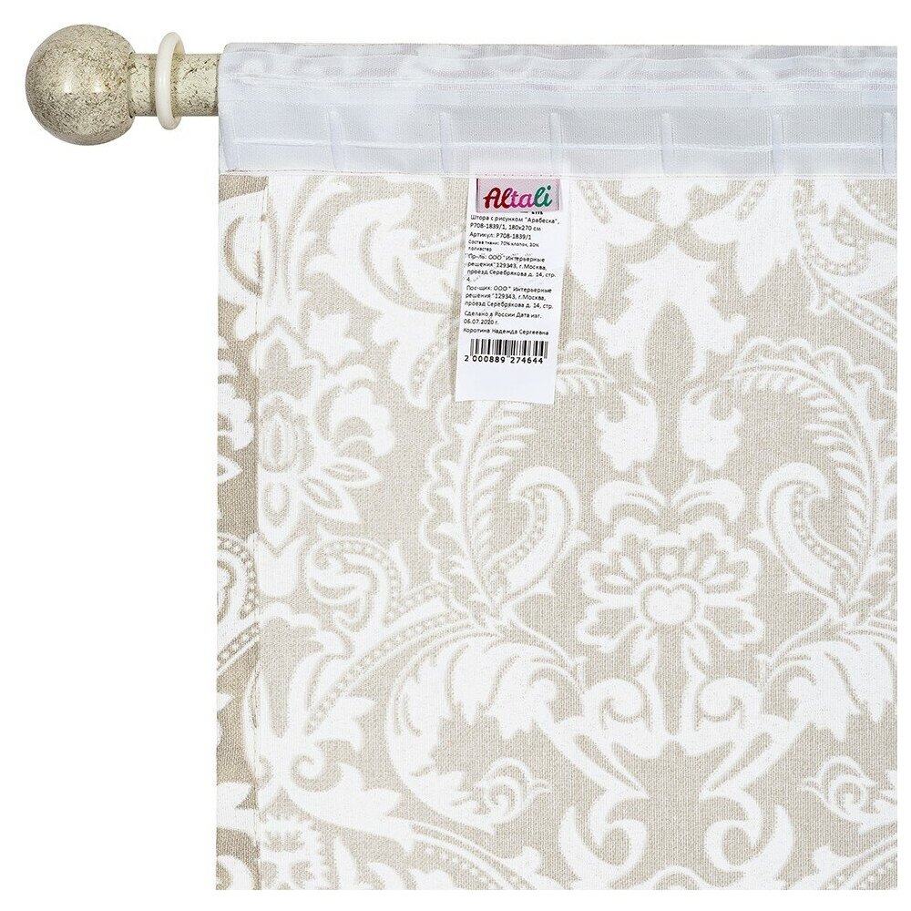 Штора размером 180х270 см изготовлена из натуральной испанской ткани (70% хлопок, 30% полиэстер). Хорошо держит форму складок, пропускает воздух и приглушает яркие солнечные лучи, помогая создавать естественное освещение. В комплект входит одно полотно на шторной ленте, с помощью которой изделие крепится к карнизу (лента расположена с изнанки шторы, позволяя регулировать ее ширину). Вид крючков возможно подобать самостоятельно - для круглого или шинного (рельсового) карнизов. При желании штору можно присборить с помощью тесьмы, закрепив ее концы с обеих сторон. Штора удачно сочетается с другими предметами интерьера в таком же дизайне. При первой стирке возможна усадка до 3%. Рекомендуемая температура стирки - 30°С в деликатном режиме. Не отбеливать, не сушить в стиральной машинке, гладить с изнаночной стороны в среднем температурном режиме, не подвергать хим. чистке.
