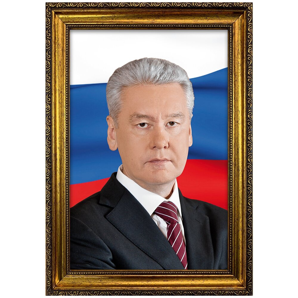 Портрет Собянина Сергея Семёновича в формате А-4 (210x297мм) – неотъемлемый атрибут делового стиля, прекрасно вписывающийся в интерьер кабинета чиновника или руководителя любого уровня. Печать изображения в высоком качестве выполнена на бумаге плотностью 150 гр/м2, которая помещена под стекло. Портрет оснащен багетной рамой под золото и петлями для подвешивания.