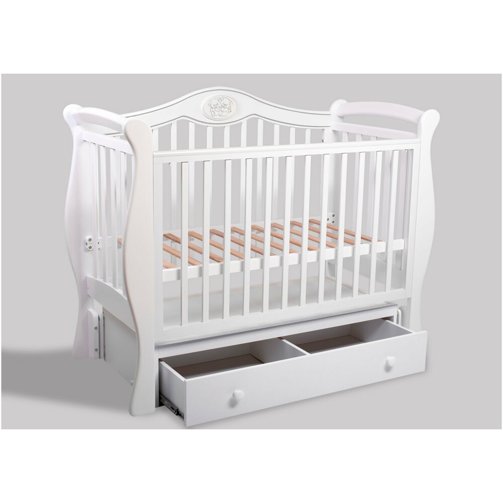 Детская кроватка из массива бука оборудована универсальным маятником. Основание кроватки отвечает за здоровье позвоночника и комфорт. Спальное место кроватки дает возможность использовать его в 2 положениях по высоте . Все элементы конструкции детских кроватей безопасны для малыша: не имеют острых углов, выступов и возможности получить занозу или травму. вТовар сертифицирован. Модель кровати Умка М имеет следующие особенности: • Накладка с Рисунком Мишки( серебреный кант и рисунок ) • Качественная обработка древесины • Экологически чистое Лако -красочное покрытие • Возможность сборки как продольным, так и поперечным маятником • Опускающееся боковое ограждение с возможностью быстрого снятия • Накладки на боковинах из пищевого пластика • Двойной фиксатор маятника • Два уровня решетки дна • Глубокий закрытый ящик • Бесшумные направляющие ящика