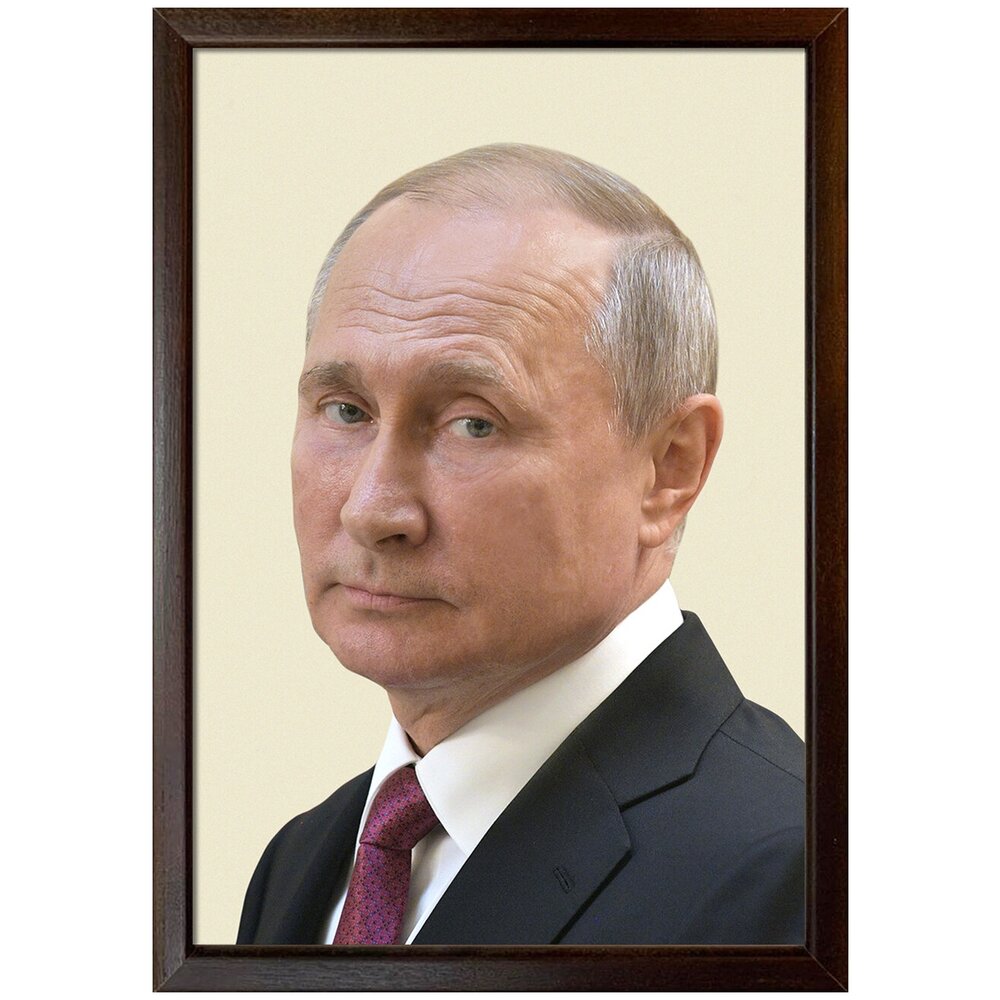 Портрет Владимирова Владимировича Путина в формате А-3 (297x420 мм) – неотъемлемый атрибут делового стиля, прекрасно вписывающийся в интерьер кабинета чиновника или руководителя любого уровня. Печать изображения в высоком качестве выполнена на бумаге плотностью 150 гр/м2, которая помещена под стекло. Портрет оснащен деревянной рамой и петлями для подвешивания.