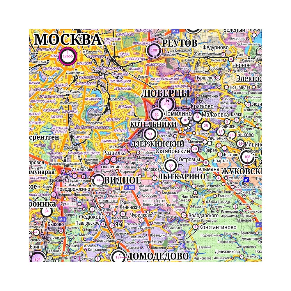 Карта отображает современное (июнь 2021 г.) административно-территориальное устройство Московской области и Москвы: все населенные пункты автомобильные, железные дороги и станции, аэропорты административное устройство Московской области и Москвы лесные, водные объекты, особо охраняемые природные территории число жителей в населенных пунктах свыше 1 тыс. чел. координатная сетка, отмывка рельефа и др. Отпечатана на интерьерном баннере — материал устойчив к влаге, не мнется, не рвется. Масштаб 1 : 250 000 (в 1 см 2,5 км).