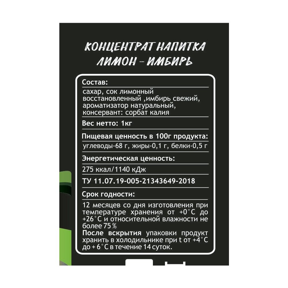 Имбирные напитки чаще всего применяются в качестве согревающего средства. Концентрированный напиток (основа для напитков) — это очень удобно и экономично. Приготовление не займет много времени — нужно всего лишь развести водой. Можно пить в любое время года как горячим так и холодным. Из 1кг концентрата вы получите до 7литров готового напитка! важно: концентрат в бутылку разливается не до горлышка, вес продукта 1кг.