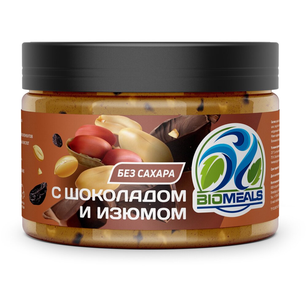 Biomeals арахисовая паста без сахара с шоколадом и кусочками изюма, 250 грамм