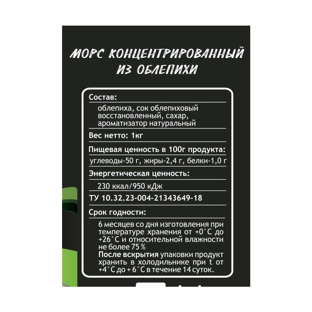 Концентрированный морс (основа для морса) — это очень удобный и экономичный напиток. Приготовление не займет много времени — нужно всего лишь развести водой. Можно пить в любое время года как холодным так и горячим, а также добавлять в чай, смешивать с другими напитками. Морс из ягод облепихи подходит для использования в согревающих напитках. Из 1кг концентрата вы получите до 7литров готового напитка! В наших морсах мы используем натуральные ингредиенты и не применяем консерванты и красители.