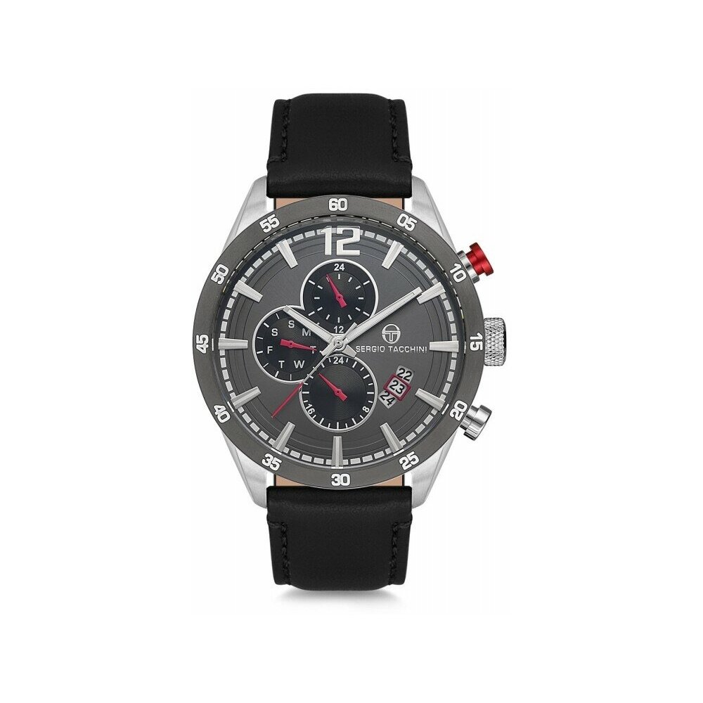 Мужские повседневные наручные часы Sergio Tacchini Archivio ST.5.148.04 Корпус: металл, цвет серебристый, размер Ø45 мм, водозащита 10 ATM Ремешок: натуральная кожа, цвет черный, размер 22 мм, тип крепления стандарт Серый циферблат, индексы, арабские цифры, стекло минеральное, особенности: второе время, дата, день недели Механизм: кварцевый аналоговый, калибр Miyota JP15