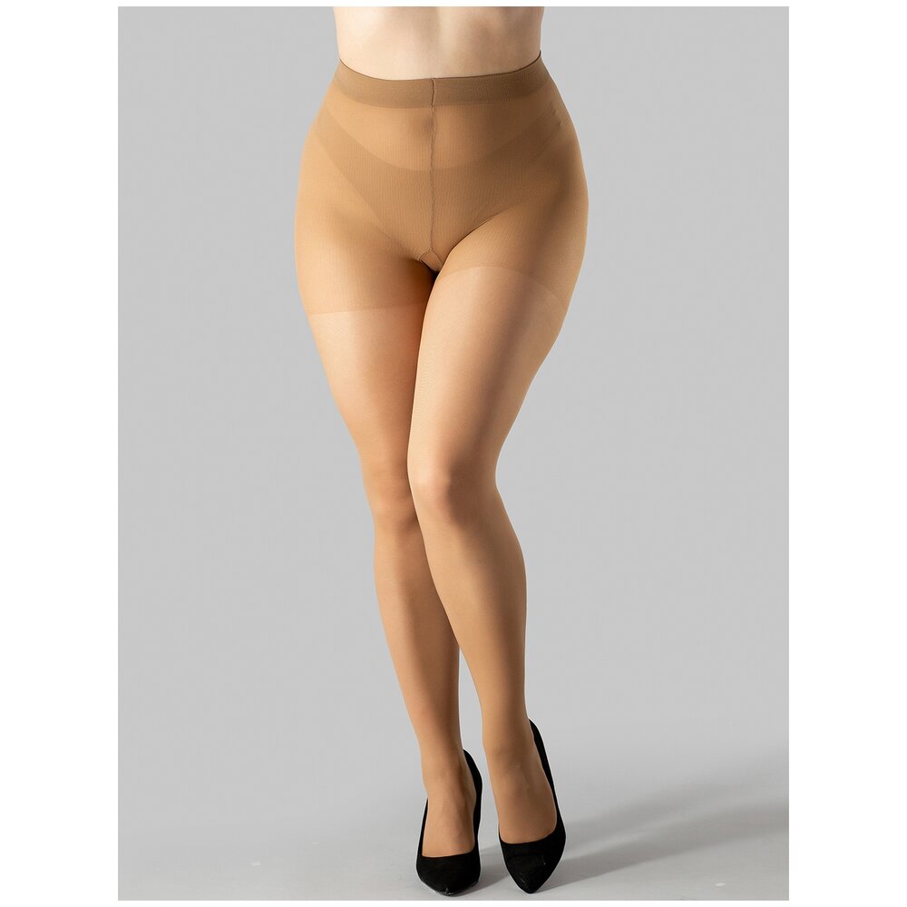 Прозрачные поддерживающие колготки с оплетенным эластаном, плотностью 40 ден, с распределенным по ноге давлением, усиленными шортиками, широким комфортным поясом и задней вставкой, позволяющей лучше растягиваться в объемах. Модель plus size (больших размеров).