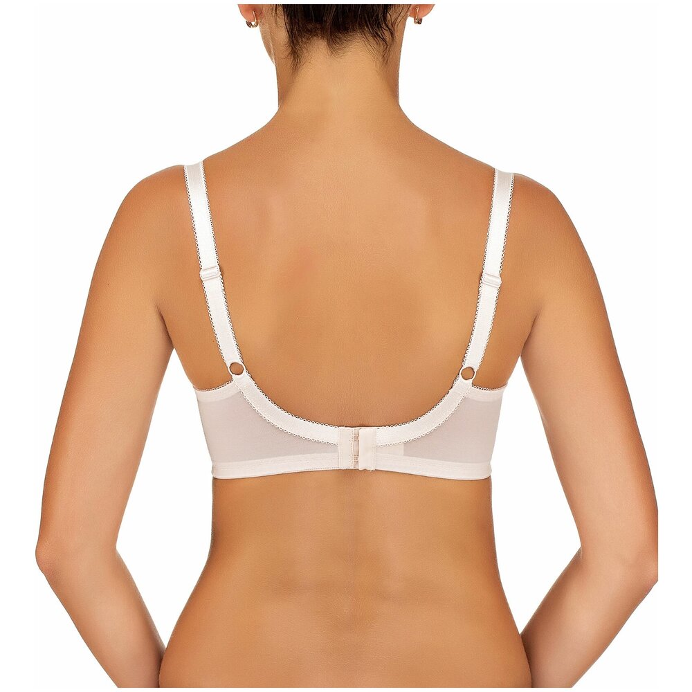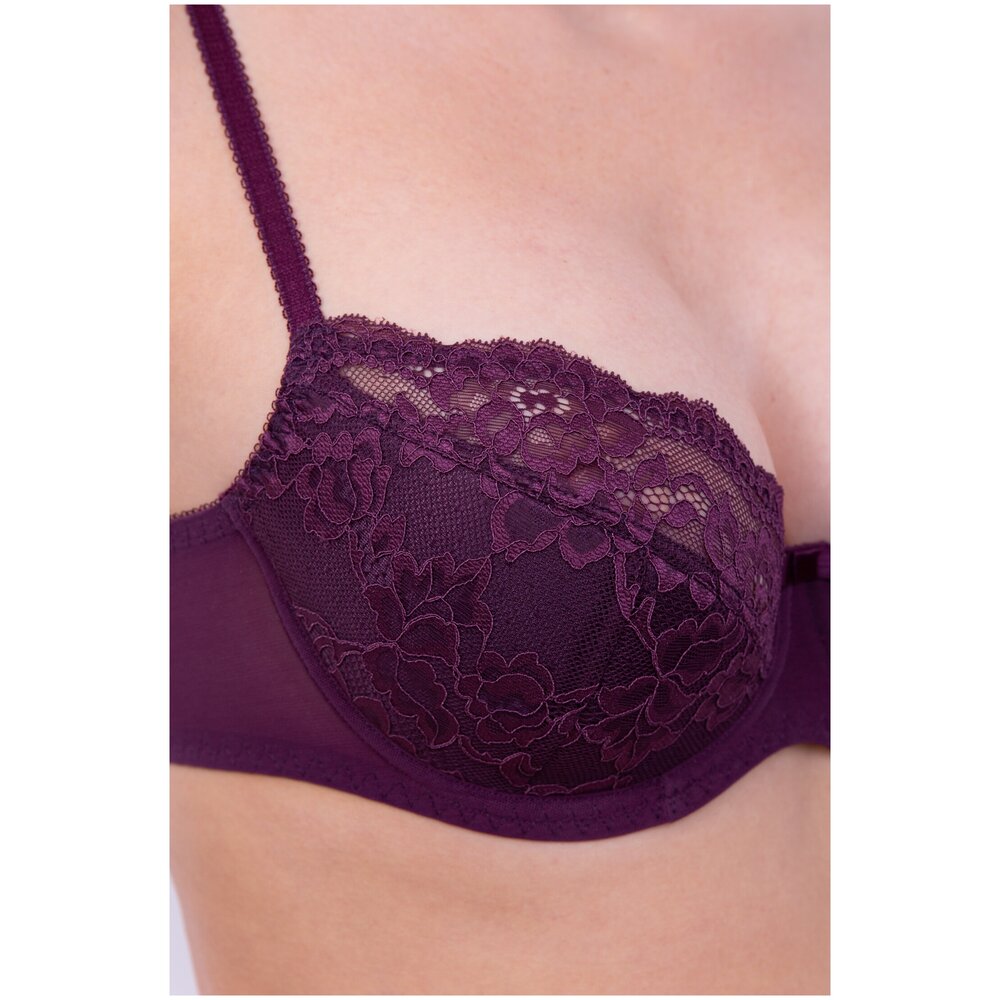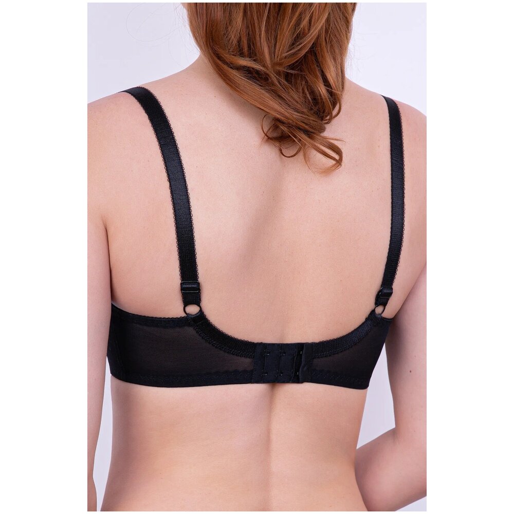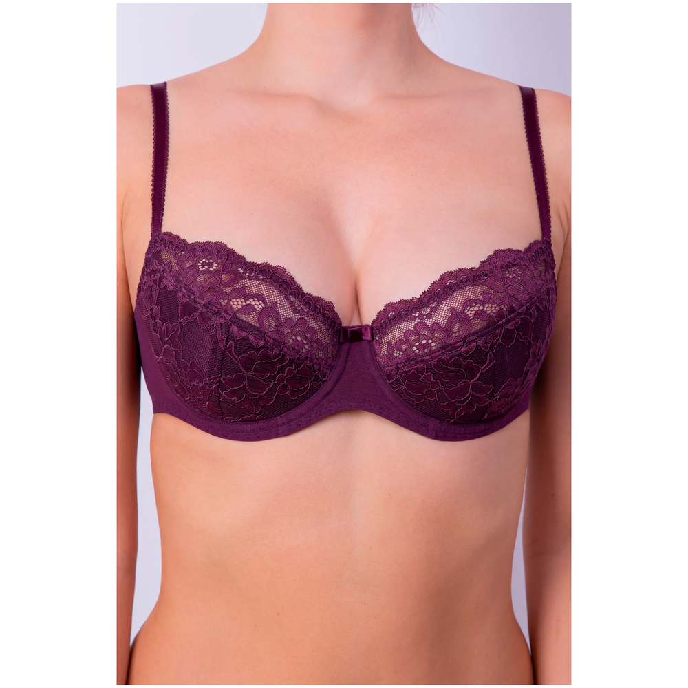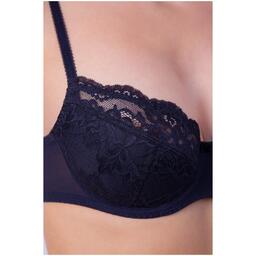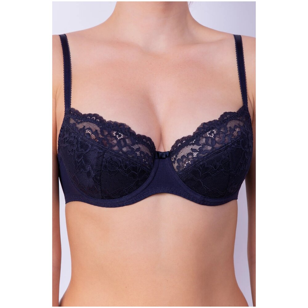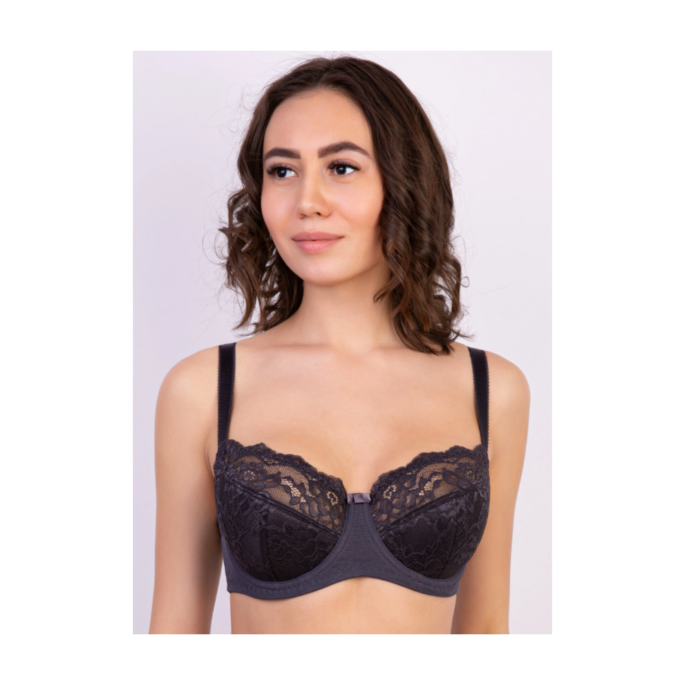 Бюстгальтер с мягкими чашками на каркасе. В основе чашки конструкция из трех деталей с диагональным членением. Чашки и центральная деталь выполнены из эластичного кружева. Нижние детали чашки и передняя часть стана продублированы хлопковой подкладкой. В боковой части чашки между кружевом о хлопковой подкладкой вработан усилитель из не эластичного капрона. Боковые детали стана из функционального эластичного сетчатого полотна. Бюстгальтер дополнен бантиком.