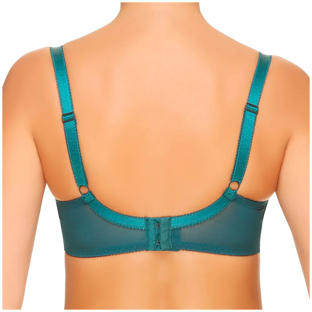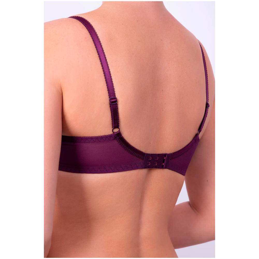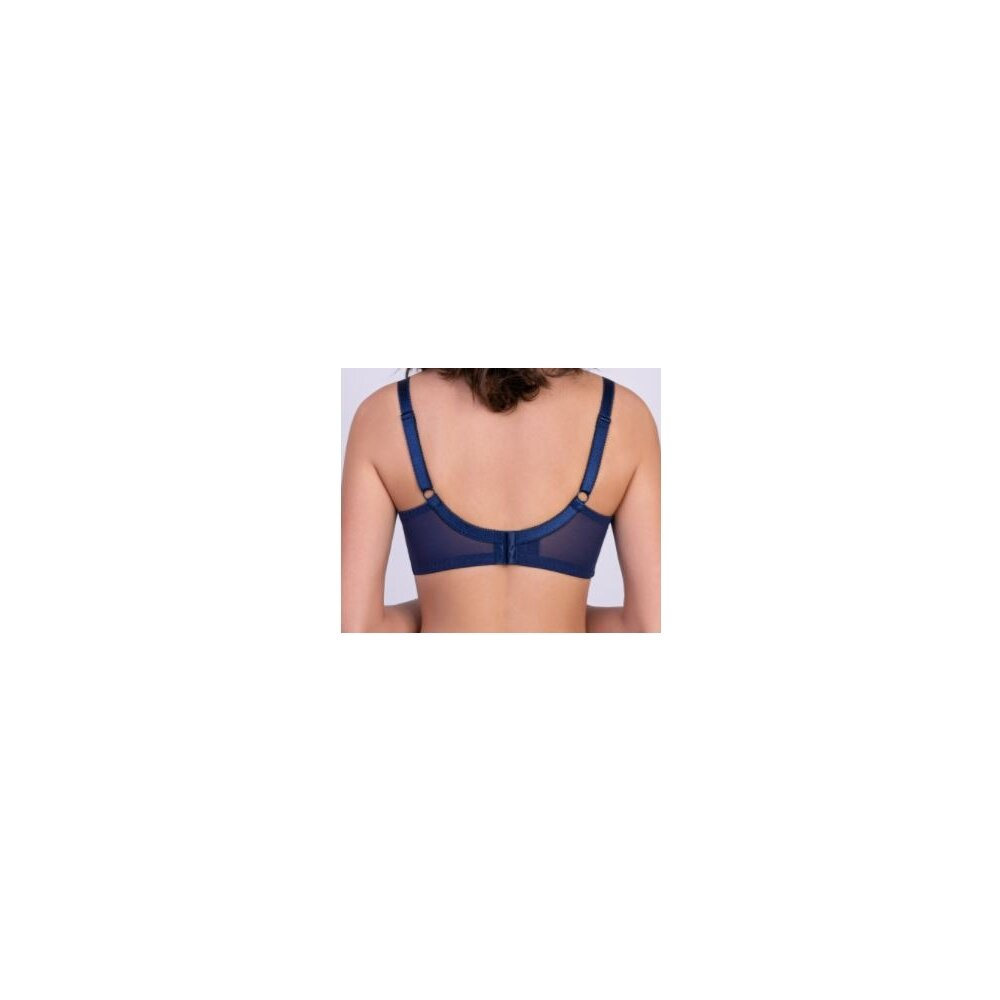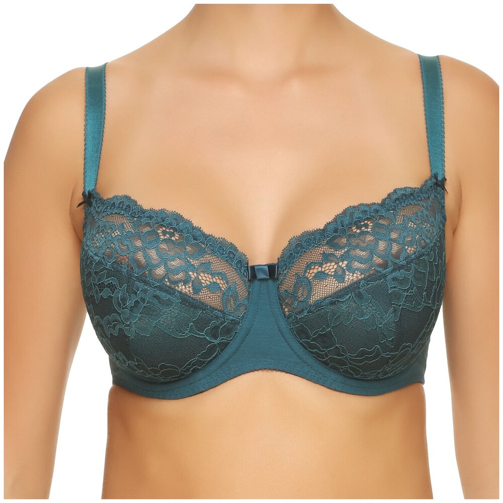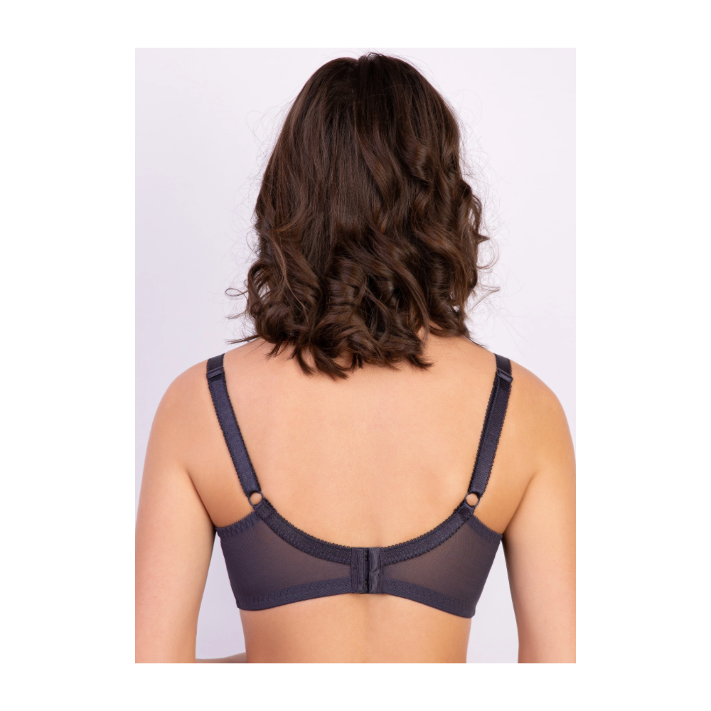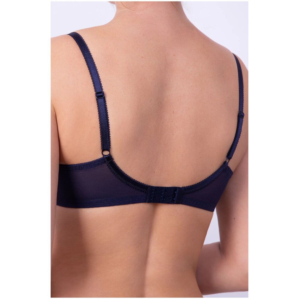 Бюстгальтер с мягкими чашками на каркасе. В основе чашки конструкция из трех деталей с диагональным членением. Чашки и центральная деталь выполнены из эластичного кружева. Нижние детали чашки и передняя часть стана продублированы хлопковой подкладкой. В боковой части чашки между кружевом о хлопковой подкладкой вработан усилитель из не эластичного капрона. Боковые детали стана из функционального эластичного сетчатого полотна. Бюстгальтер дополнен бантиком.