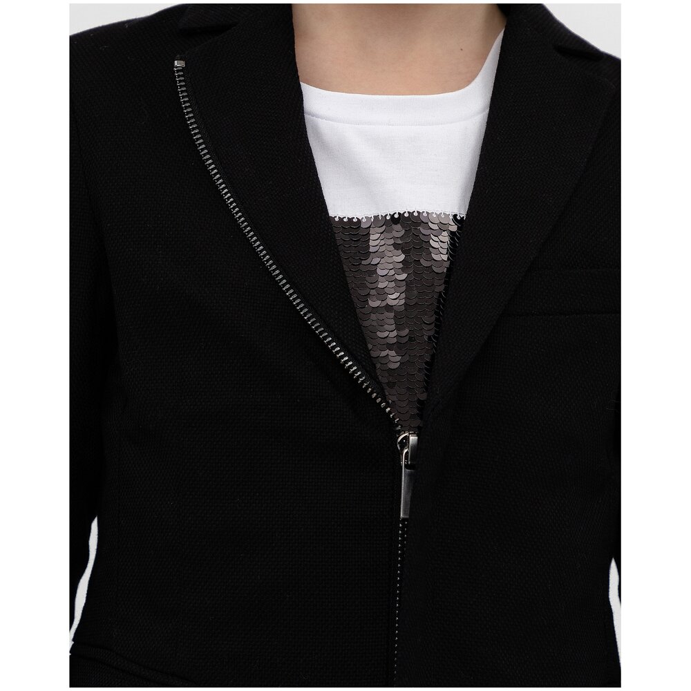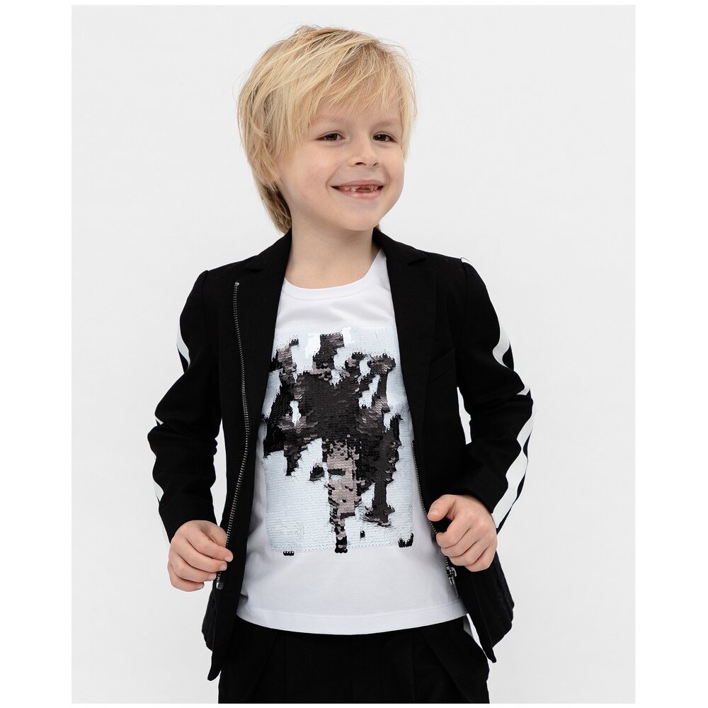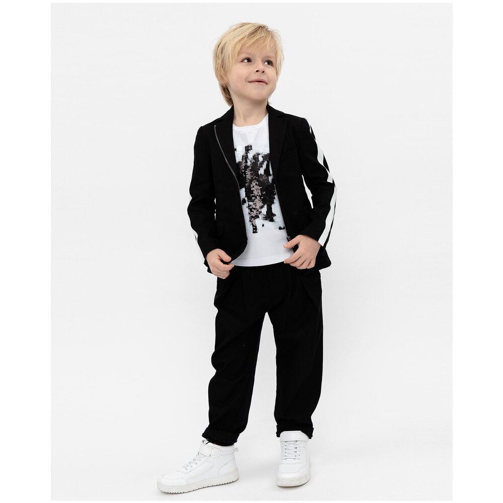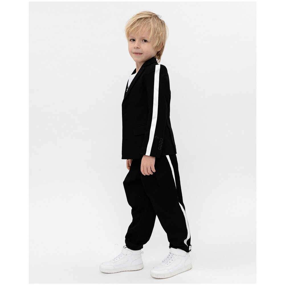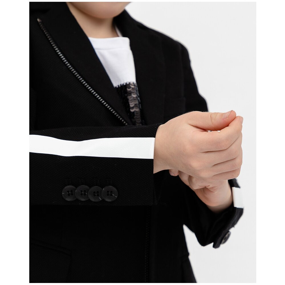 Стильный пиджак с белыми лампасами — новая остромодная вещь, которая сделает образ ребёнка неотразимым. И с белой футболкой, и с белой рубашкой, и с брюками, составляющими комплект, и с рваными джинсами, вносящими в образ нотку дерзости, пиджак будет выглядеть потрясающе, выделяя ребёнка из толпы сверстников. Благородная фактурная ткань придаёт модели особый шарм. Идеальная посадка по фигуре сделает образ элегантным, стильным, современным.