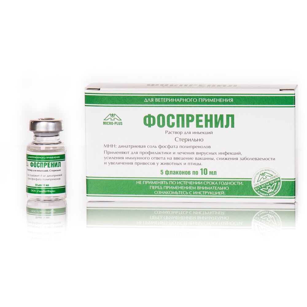 - Способ применения и дозы препарат вводят главным образом внутримышечно. При лечении вирусных инфекций собак разовая доза фоспренила составляет 0,1 мл на 1 кг массы тела. При лечении вирусных инфекций кошек разовая лечебная доза фоспренила составляет 0,2 мл на 1 кг массы тела. При тяжелых и среднетяжелых клинических формах вирусных инфекций разовая лечебная доза фоспренила должна быть удвоена: собакам — 0,2 мл на 1 кг массы тела; кошкам — 0,4 мл на 1 кг массы тела. Возможно применение препарата внутрь собакам и кошкам, при этом следует использовать разовую дозу, увеличенную в 2 раза по отношению к внутримышечной. При лечении вирусных заболеваний телят разовая внутримышечная доза составляет 0,1 мл на 1 кг массы тела. При лечении вирусных энтеритов поросятам-сосунам массой 3 – 5 кг вводят внутримышечно в течение 8 суток по 0,5 мл фоспренила. Схема лечения зависит от вида заболеваний. Универсальный курс при тяжелых формах чумы плотоядных у собак, панлейкопении и инфекционном перитоните у кошек состоит из 40 доз: с 1-го по 2-й день – 4 дозы в сутки (через каждые 6 часов), с 3-го по 10-й день – 3 дозы в сутки (через каждые 8 часов), с 11-го по 13-й день – 2 дозы в сутки (через каждые 12 часов), 14-й и 15-й дни – 1 доза в сутки. При среднетяжелых формах чумы плотоядных у собак, панлейкопении и инфекционном перитоните у кошек, а также при парвовирусом энтерите и гепатите у собак применяется следующая схема лечения: в 1-й день – 4 дозы в сутки (через каждые 6 часов), со 2-го по 8-й день – 3 дозы в сутки (через каждые 8 часов), с 9-го по 11-й день – 2 дозы в сутки (через каждые 12 часов), с 12-го по 15 день – 1 доза в сутки. При легком течении тех же вирусных инфекций, а также при аденовирозах у собак и вирусном ринотрахеите у кошек принципиальная схема лечения остается такой же, но общая продолжительность курса сокращается до 3 – 7 суток: в 1-й день (либо в первые 2 – 3 дня) – 3 дозы в сутки (через каждые 8 часов), во 2-й день (либо на 3 – 5-й дни) – 2 дозы в сутки (через каждые 12 часов), на 3-й день (либо на 5 – 7-й дни) – 1 доза в сутки. При легком течение чумы плотоядных (начальная стадия) общая продолжительность лечения должна быть не менее 2-недель. При лечении вирусных заболеваний телят применяется следующая схема: в 1-й день – 4 инъекции в сутки (через каждые 6 часов), со 2-го по 4-й день – 3 инъекции в сутки (через каждые 8 часов), на 5-й день – 2 инъекции в сутки (через каждые 12 часов). При необходимости курс лечения можно продлить до 7 суток, вводя по разовой дозе препарата 2 раза в день. При лечении вирусных энтеритов поросят применяется следующая схема лечения: в 1-й день – 4 инъекции в сутки (через каждые 6 часов), со 2-го по 4-й день – 3 инъекции в сутки (через каждые 8 часов), с 5-го по 7 день – 2 инъекции в сутки (через каждые 12 часов), на 8-й день – 1 инъекция в сутки. Лечебную схему можно корректировать в зависимости от тяжести заболевания и особенности индивидуальной чувствительности организма. При необходимости возможно назначение повторных курсов лечения. При тяжелых и среднетяжелых клинических формах вирусных инфекций необходимо применять фоспренил в сочетании с антибиотиками, противогистаминными препаратами и симптоматической терапией, направленной на коррекцию водно-солевого и кислотно-щелочного равновесия, детоксикацию организма, нормализацию температуры тела и поддержание жизненно важных органов. Допол