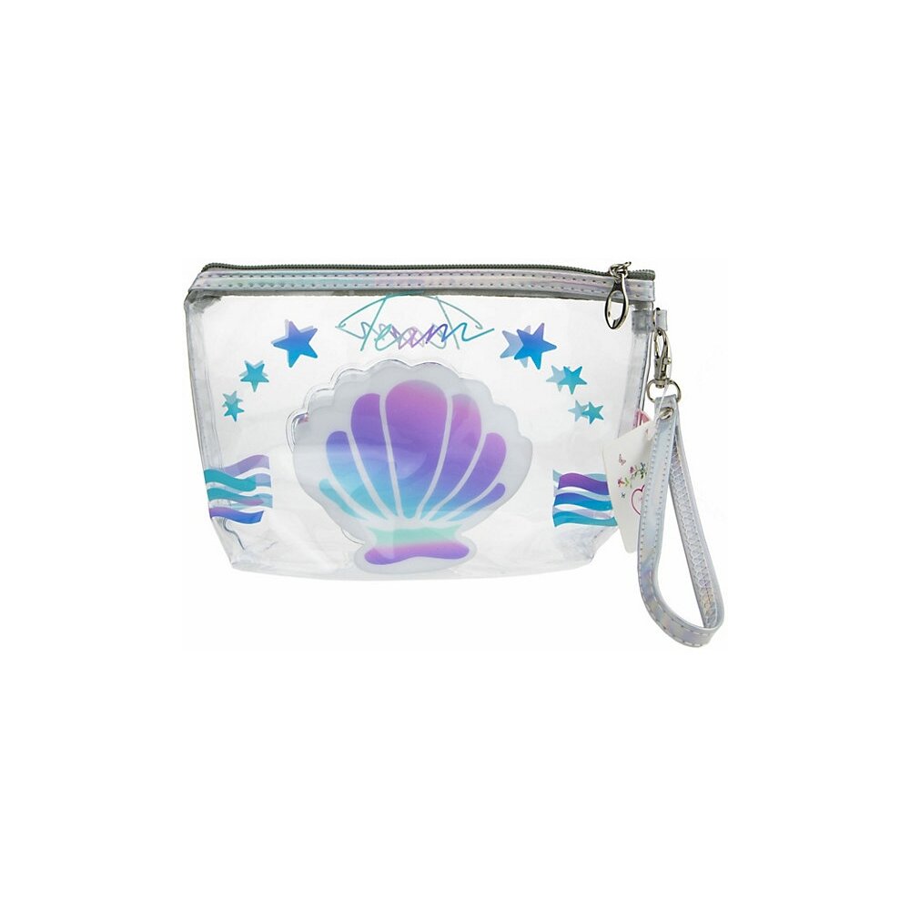 Прозрачная косметичка, украшенная декоративным элементом в виде ракушки с жидкостью и морскими звёздочками, которые плавают внутри косметички. На косметичке также изображены звёздочки. В комплект входит съемный голографический ремешок.