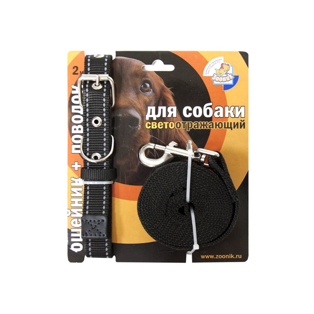 Комплект капроновый поводок 2м+ошейник «Зооник» 37-51 см*25 мм черный со светоотражающей лентой на блистере