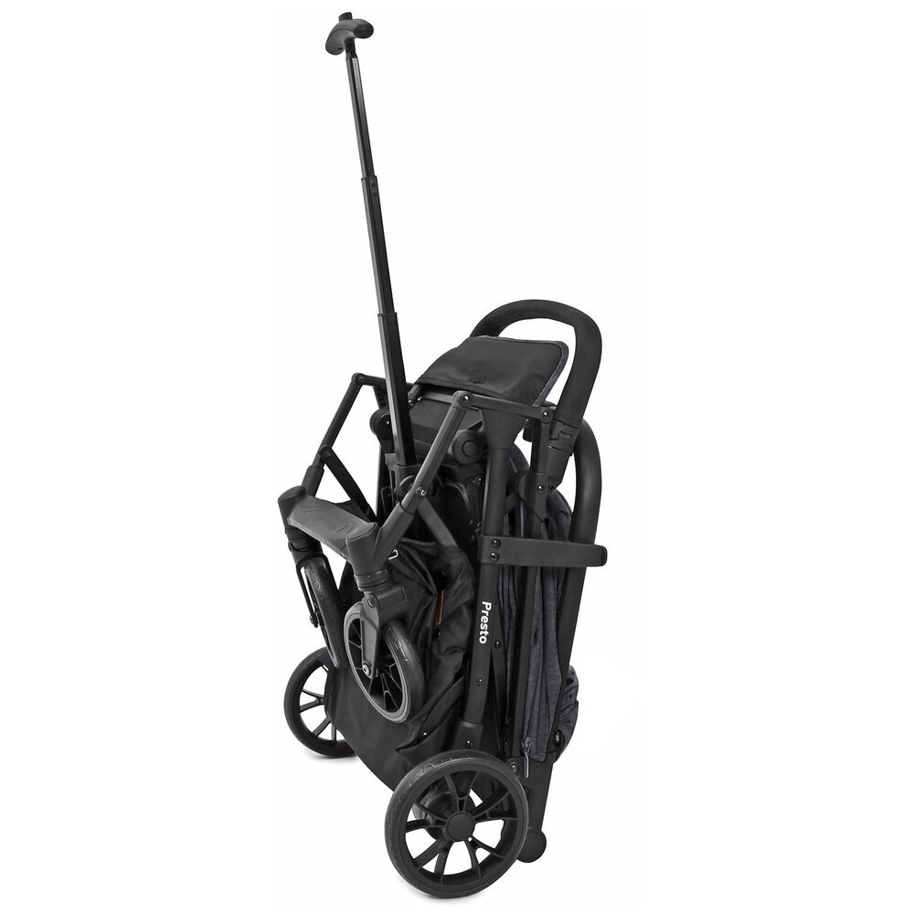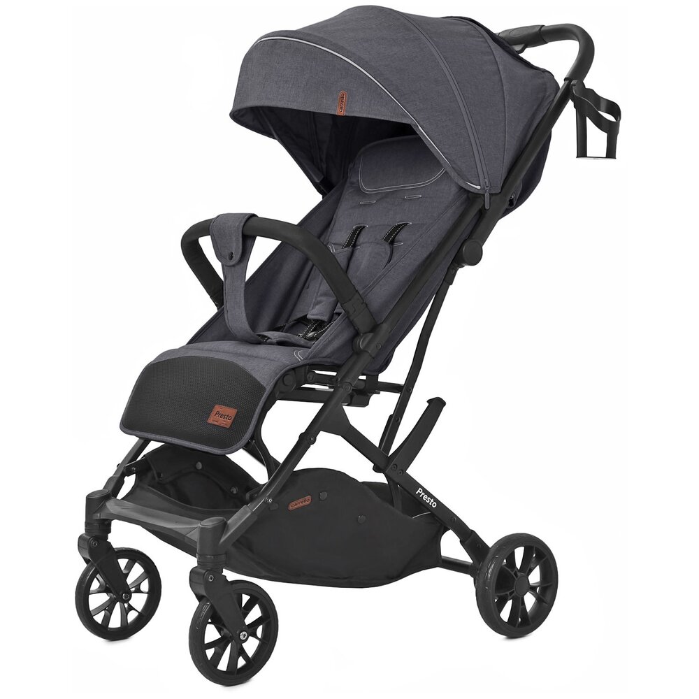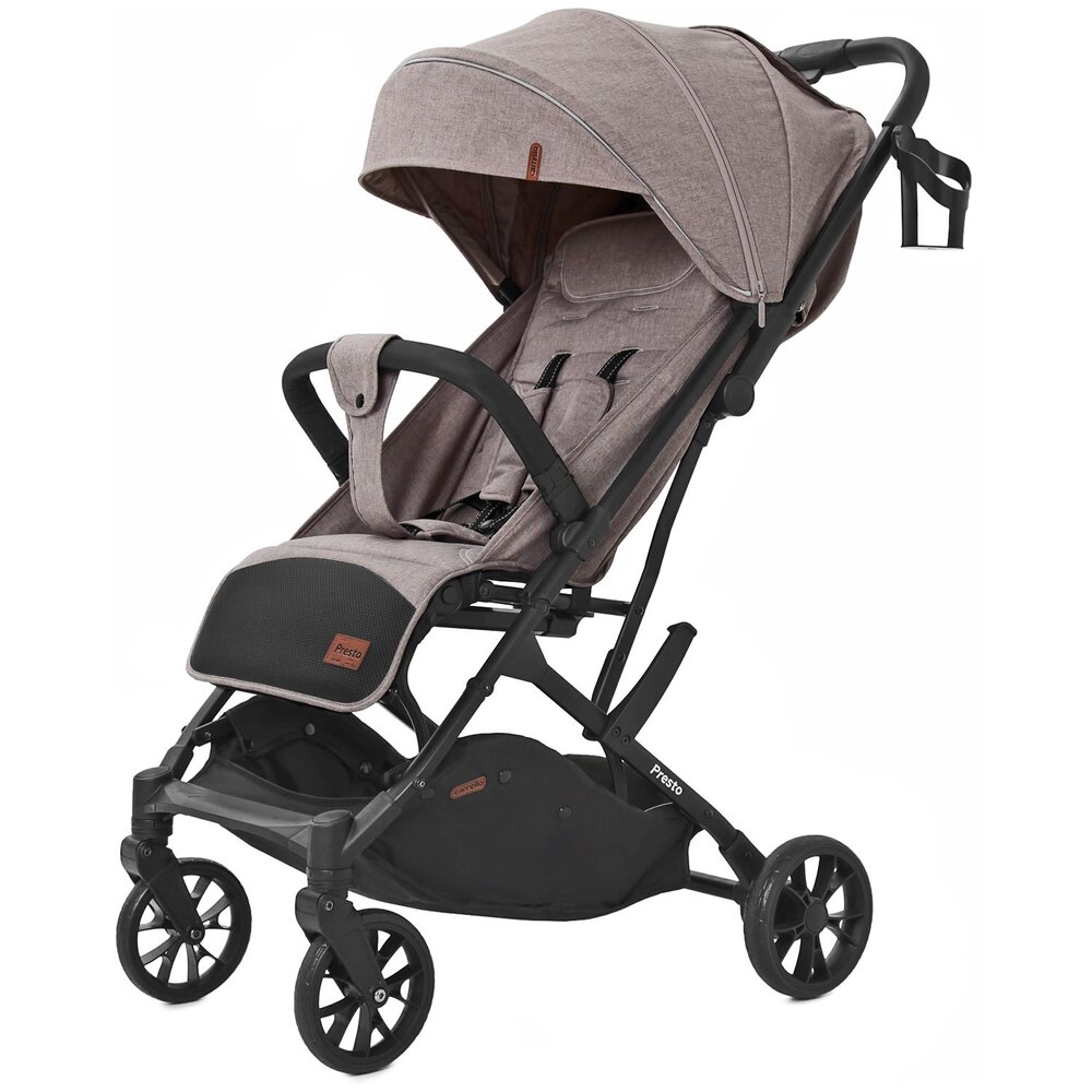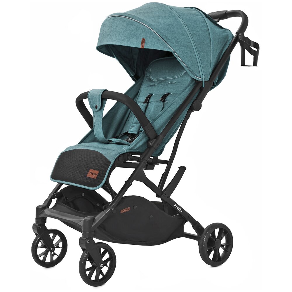 Маневренная городская коляска с отличным функционалом.Модель Presto идеальна для тех, кто выбирает активный образ жизни, частые прогулки и автопутешествия. Минимальные габариты и удобная ручка для легкой транспортировки. Плотный футкавер и глубокий капюшон до бампера защитят малыша от ветра и непогоды. Прочная конструкция рассчитана на максимальную нагрузку 22 кг. Мягкая амортизация передних и задних колёс. Твердая спинка с удобной ременной регулировкой и отзывчивый ножной тормоз. Коляска легко складывается и раскладывается одной рукой. Капюшон опускается вплотную до бампера, имеется окошко для наблюдения за малышом.<br />Характеристики товара и аксессуары<br />Размер в разлож. виде, ДхШхВ - 84x53x103 см;<br />Размер сиденья, ДхШхГ - 80x34x20 см;<br />Вес коляски - 8.5 кг;<br />Макс. нагрузка - 22 кг;<br />Тип складывания - книжка;<br />Смотровое окно - есть;<br />Регулировка высоты ручки - нет;<br />Регулировка спинки - плавная, включая «лёжа»;<br />Функция вентиляции - есть;<br />Бампер - есть, съёмный, поворотный;<br />Корзина - есть;<br />Тип колёс - передние поворотные, фиксация «прямо»;<br />Материал колёс - полиуретан;<br />Аксессуары - укрытие для ножек, подстаканник.