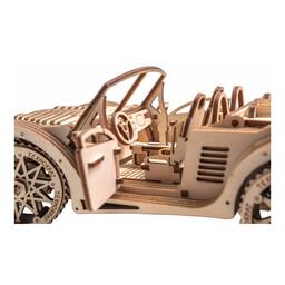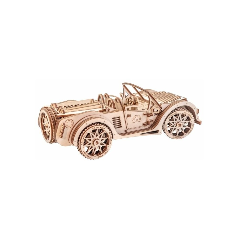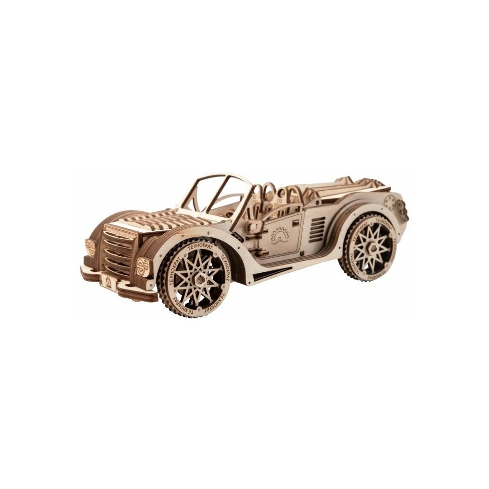 “Машинки” - любимая игрушка мальчиков всех возрастов. Да-да, даже в 40 лет мужчина сохраняет в своем сердце любовь к этим игрушкам, с которыми с упоением возился в детстве. Попробуйте собрать родстер “Технократ” вместе со своим ребенком и снова окунитесь с головой в мир фантазий и грез. Кроме того, такое занятие способствует духовному сближению отцов и детей. Как без капли клея в составе изделия удалось сделать его таким надежным? Пусть это останется нашей маленькой тайной. Но, как ни крути, технократ родстер с успехом прошел все испытания на прочность. Двери и капот открываются. Под капотом скрывается самый что ни на есть мотор. Он, понятное дело, ненастоящий, но поршни у него вполне работают. Модель может свободно двигаться вперед и назад. Вы спросите, как? Все просто: на родстере установлен второй двигатель – уже не бутафорский, на резинке! Руль крутится, колеса движутся…