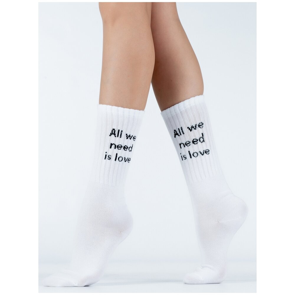 Хлопковые высокие женские носки-полугольфы с комфортной широкой резинкой "в рубчик". На боковой части резинки модели размещена контрастная надпись "All We Need Is Love".