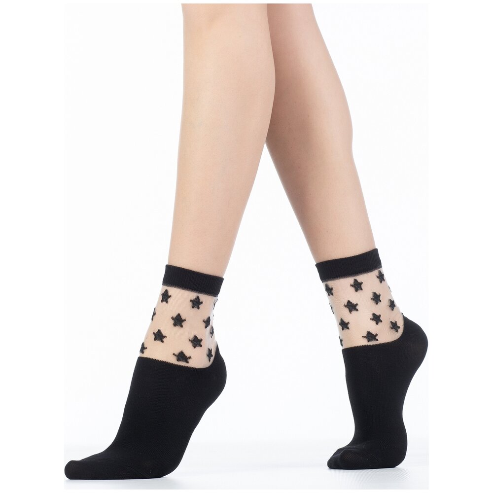 Женские фантазийные носки под кроссовки, выполненные из хлопка и прозрачной синтетической мононити. Под резинкой модели размещена контрастная вставка с узором "звезды".
