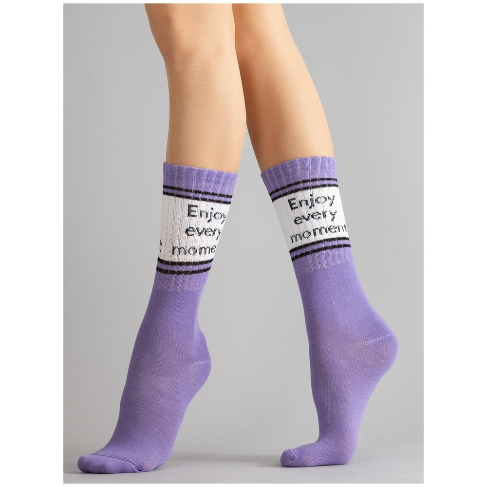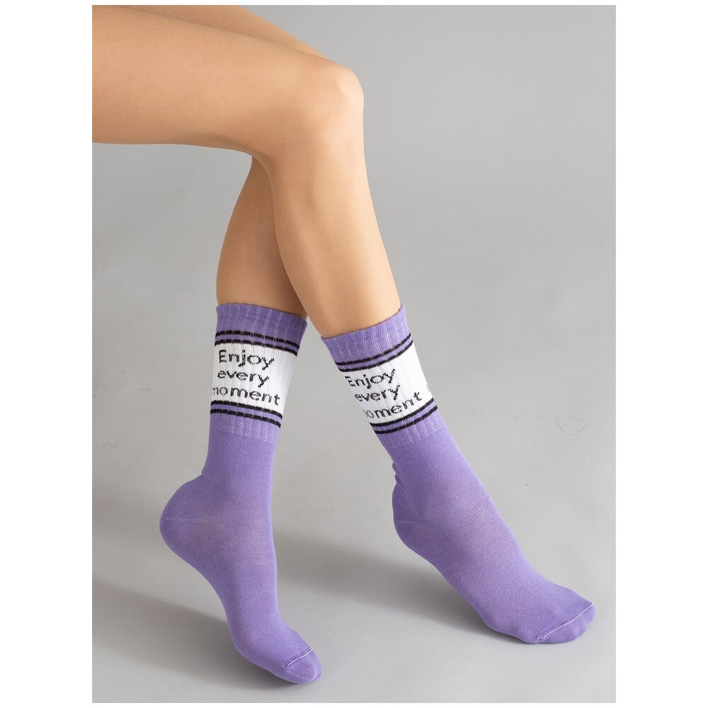 Хлопковые высокие женские носки-полугольфы с комфортной широкой резинкой "в рубчик". На резинке модели размещен контрастный блок с надписью "Enjoy Every Moment".