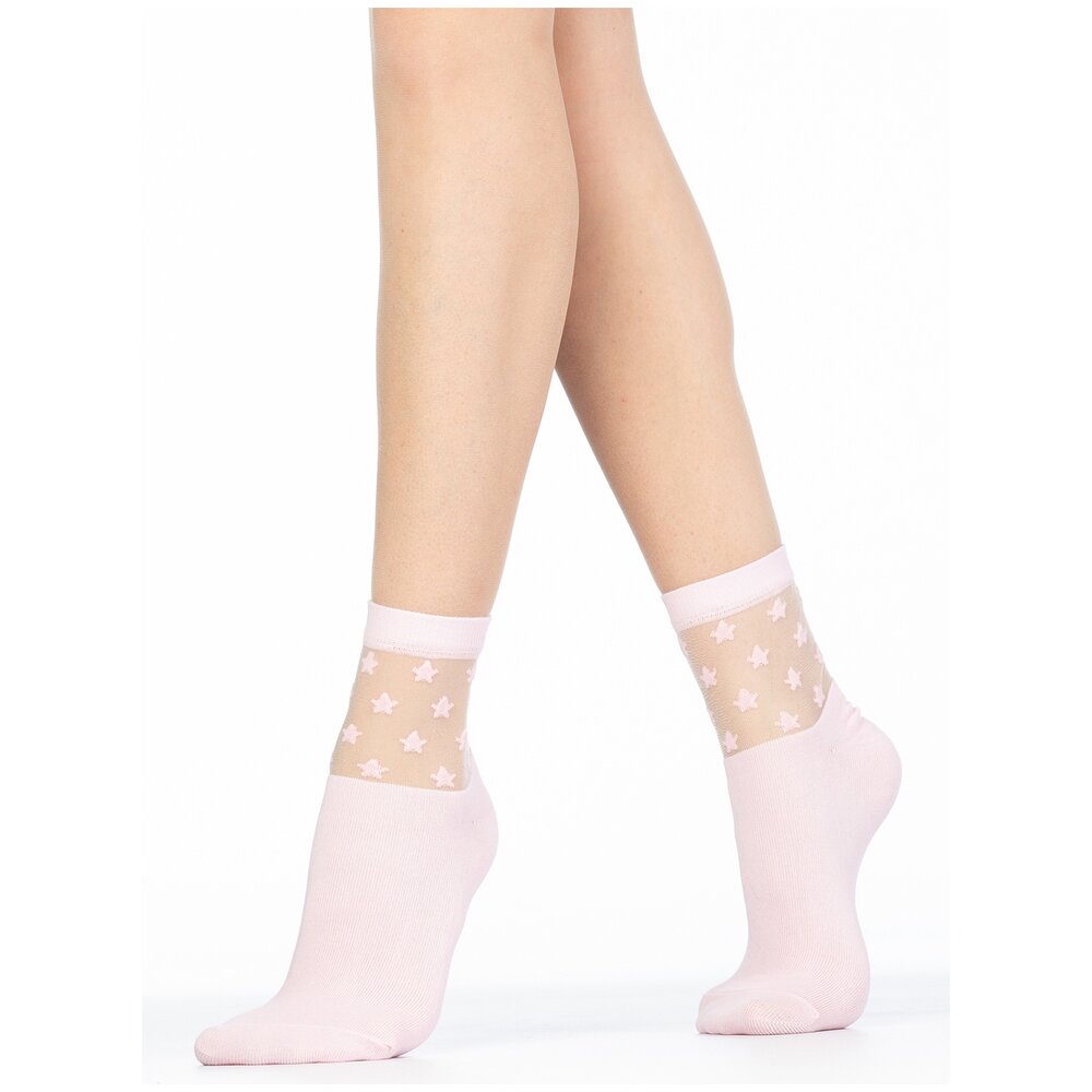 Женские фантазийные носки под кроссовки, выполненные из хлопка и прозрачной синтетической мононити. Под резинкой модели размещена контрастная вставка с узором "звезды".