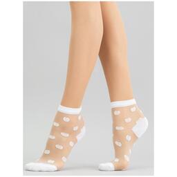 Женские фантазийные носки под кроссовки, выполненные из хлопка и прозрачной синтетической мононити. Пятка и мысок модели усилены, по всей длине размещен рисунок "крупный горошек".