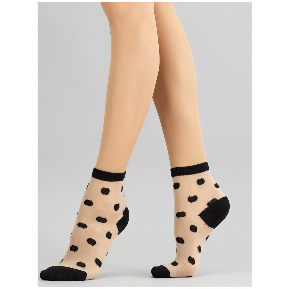 Женские фантазийные носки под кроссовки, выполненные из хлопка и прозрачной синтетической мононити. Пятка и мысок модели усилены, по всей длине размещен рисунок "крупный горошек".