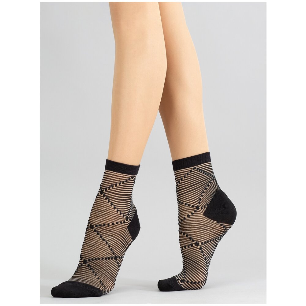 Женские фантазийные носки из хлопка и прозрачной синтетической мононити. Пятка и мысок модели усилены, по всей длине размещен геометрический рисунок "полоски и ромбы".