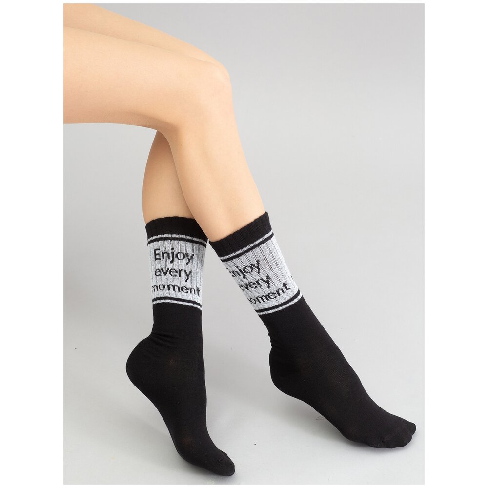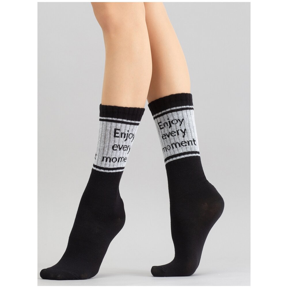 Хлопковые высокие женские носки-полугольфы с комфортной широкой резинкой "в рубчик". На резинке модели размещен контрастный блок с надписью "Enjoy Every Moment".