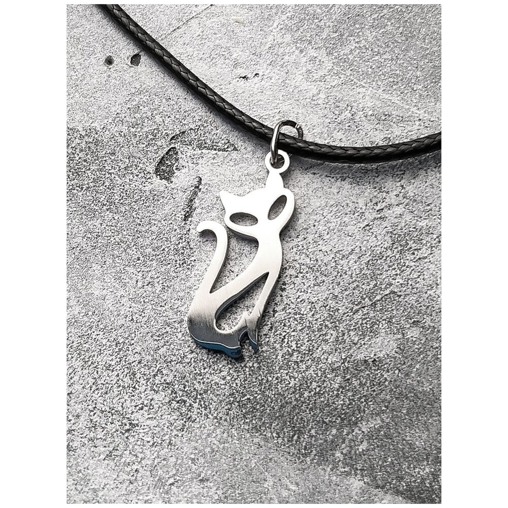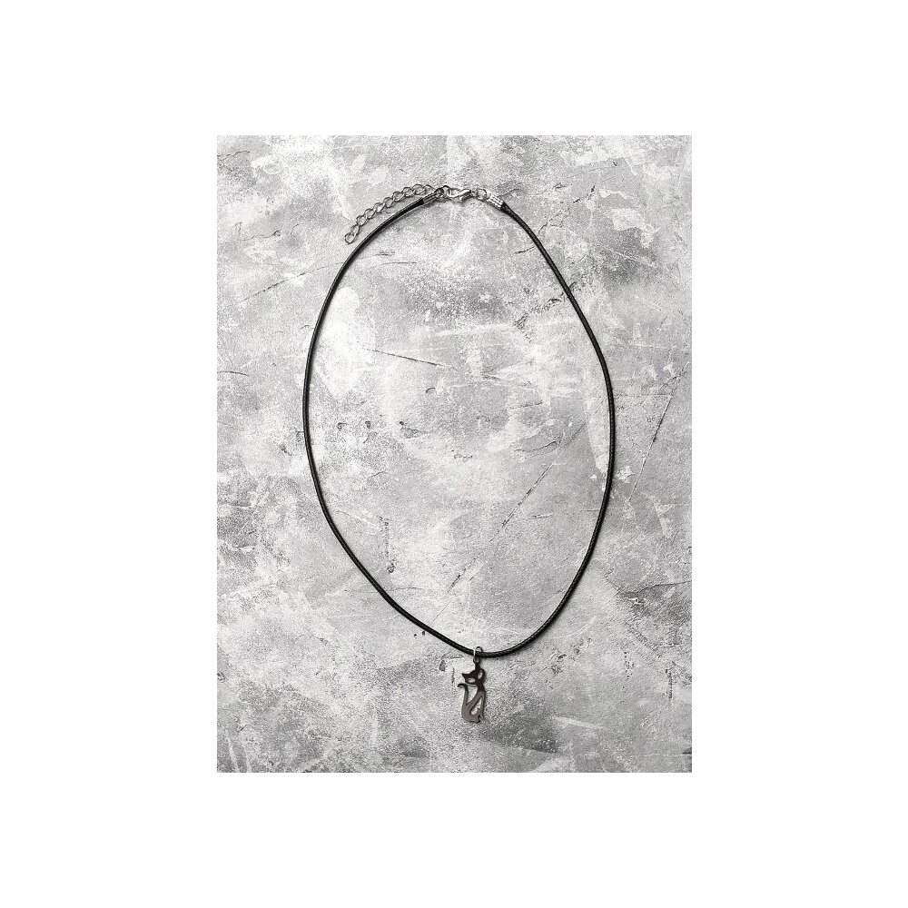 Колье в виде шнура с миниатюрной металлической подвеской. Застежка: карабин. Длина: 45-48 см (в расправленном виде). Размер регулируется цепочкой. Подвеска: 10х20 мм.