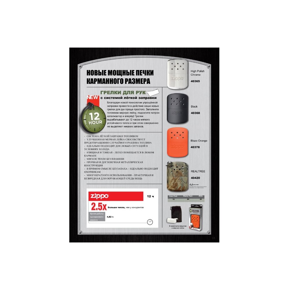 Каталитическая грелка Zippo идеально подходит чтобы согреть руки мягким теплом без пламени. Возьмите ее с собой в поход, на стадион или на лыжную трассу. Чтобы привести грелку в действие заполните топливом мерную лейку, подожгите патрон-катализатор и наслаждайтесь теплом!Вырабатывает до 12 часов мягкого устойчивого тепла и не выделяет никаких запаховСистема легкой заправки топливомУлучшенная мерная лейка для предотвращения случайного разлива топливаКомпактный размер — легко помещается в любом кармане Прочный металлический корпус