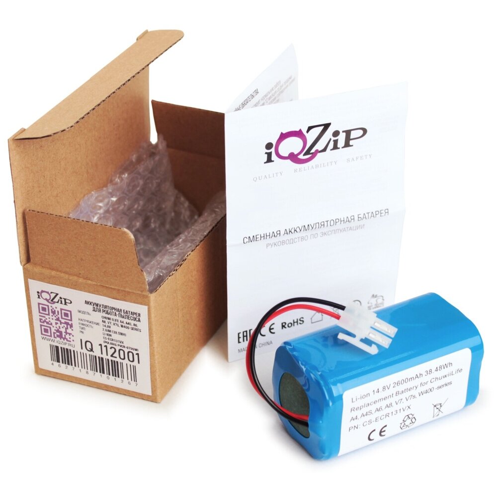 Аккумулятор iQZiP для робота-пылесоса Chuwi iLife A4, A4S, A6, A8, V7, V7s, W400 -series 14.8V 2.6Ah (Li-Ion) PN: CS-ECR131VX Полностью совместим с устройством Chuwi и обеспечит максимальную производительность в процессе эксплуатации.\n\nНовая батарея вдохнёт новую жизнь Вашему домашнему помощнику и будет помогать содержать дом в чистоте долгое время. \n\nВся продукция iQZiP проходит через многоуровневую систему контроля качества, благодаря чему мы гарантируем безотказную работу как минимум 12 месяцев с начала эксплуатации. Для увеличения срока службы нового аккумулятора рекомендуется произвести несколько циклов полной разрядки и зарядки.\n\nосновные характеристики:\nНапряжение : 14.8В\nЁмкость : 2.6Ah (38.48Wh)\nТип аккумулятора: Li-ion\nСписок совместимых устройств: 4ICR1965, 4INR1966, UR18650ZT-4S1P-AAF, BTG200, CS-ECR131VX, Chuwi iLife A4, Chuwi iLife A4S, Chuwi iLife A6, Chuwi iLife V7, Chuwi iLife V7s Pro, Chuwi iLife V7s Plus, Chuwi iLife W400, Polaris PVCR-0726W, Polaris PVCR-0826, Polaris PVCR-0926W, Polaris PVCR-1126W, Kitfort KT-519, Kitfort KT-520, Kitfort KT-529, Kitfort KT-533, iBoto Smart X610G, Aqua Easy Home X410, Liectroux X5S Genio, Deluxe 500, GUTREND STYLE 200, Aqua DIBEA V870, ECOVACS CEN 540, Deebot CR130 V780, A40, 4ICR19/65, 4INR19/66, Chuwi iLife V7, Polaris PVCR-1126W, Kitfort KT-533, Liectroux X5S, Genio Deluxe 500, Deebot CR130, Deebot V780, Chuwi iLife A4S, Chuwi iLife A40, Chuwi iLife A8, Chuwi iLife V7s, Chuwi iLife X620, Chuwi iLife Y8H4, Chuwi iLife W400, Polaris PVCR 0930 SmartGo, Kitfort KT-519, Kitfort KT-520, iBoto Smart X610G Aqua, iBoto Smart X615GW Aqua, iBoto Smart Easy Home X410, Liectroux X5S, Genio Deluxe 500, GUTREND FUSION 150, GUTREND STYLE 200 Aqua, GUTREND STYLE 220, GUTREND SMART 300, GUTREND SENSE 410, DIBEA V870, ECOVACS CR120, ECOVACS CR130, ECOVACS Deebot CEN540, ECOVACS Deebot CEN546, ECOVACS Deebot CEN550, ECOVACS Deebot CEN640, ECOVACS Deebot CEN646, ECOVACS Deebot CEN660, ECOVACS Deebot CR120, ECOVACS Deebot CR130, ECOVACS Deebot DL33, ECOVACS Deebot DL35, ECOVACS Deebot KK8, ECOVACS Deebot V780, ECOVACS Deebot X500, ECOVACS Deebot X580, KK8, V7, V780, V7S, 18650B4/4S1P/AAF/4, BTG410