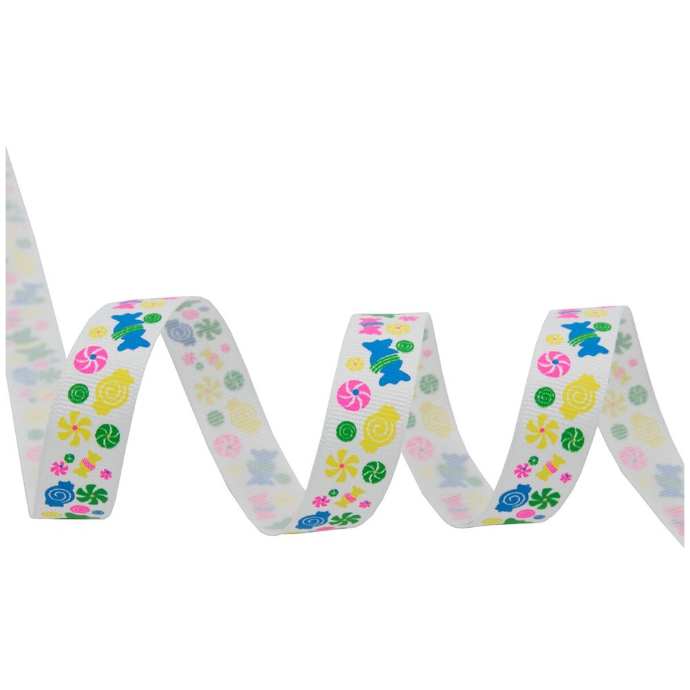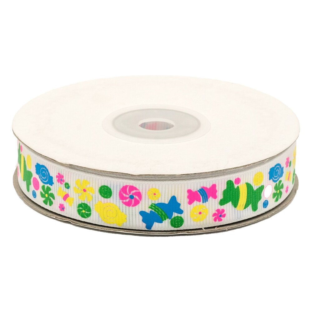 Лента репсовая с принтом 'Конфетки', ширина 1,5 см. Репсовая лента – это тканая лента с поперечными рубчиками, которые получаются за счет специального переплетения нитей. Лента обрамлена кромкой, имеет довольно жесткую структуру и хорошо держит форму. Это отличный материал для декорирования одежды, упаковки подарков ручной работы. Лента подходит для оформления фотоальбомов, открыток, шкатулок, аксессуаров и других оригинальных изделий. Лентой можно дополнить букет цветов, подарочную коробку, пакет. Её используют для творчества в различных техниках, а также для изготовления бижутерии. Качественный материал с рисунком. Цена за 22.86 м