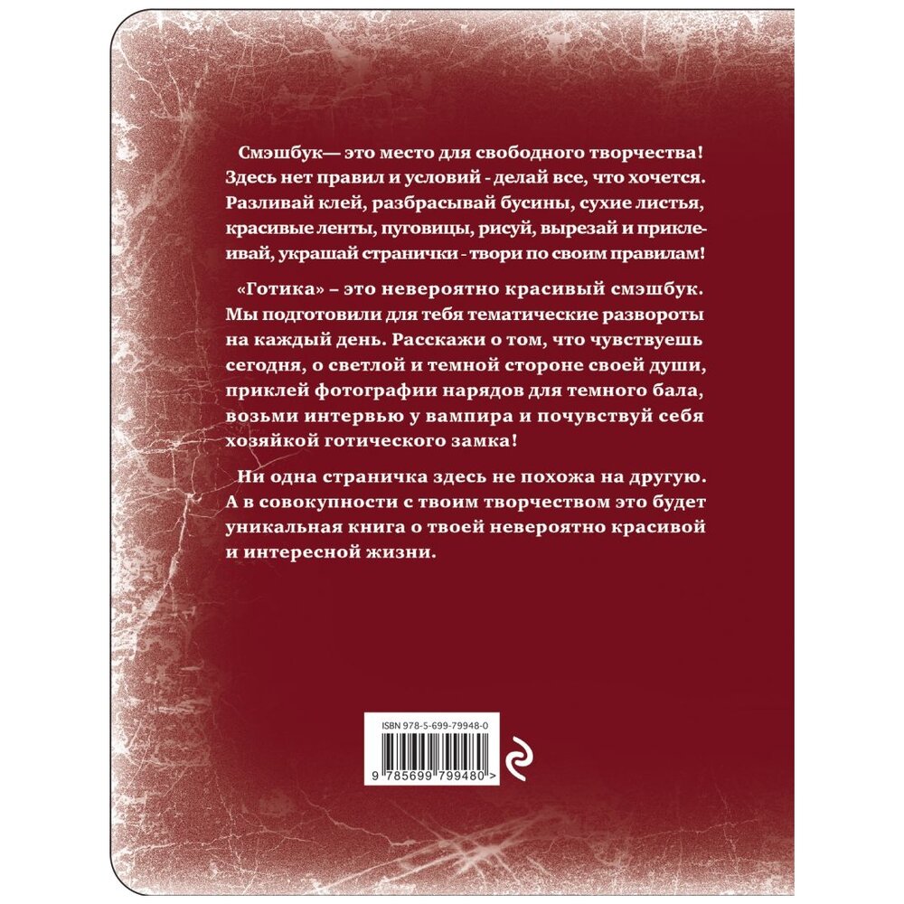 Смэшбук - это место для свободного творчества! Здесь нет правил и условий - делай все, что хочется.<br />Разливай клей, разбрасывай бусины, сухие листья, красивые ленты, пуговицы, рисуй, вырезай и приклеивай, украшай странички - твори по своим правилам!<br />"Готика" - это невероятно красивый смэшбук. Мы подготовили для тебя тематические развороты на каждый день. Расскажи о том, что чувствуешь сегодня, о светлой и темной стороне своей души, приклей фотографии нарядов для темного бала, возьми интервью у вампира и почувствуй себя хозяйкой готического замка!<br />Ни одна страничка здесь не похожа на другую. А в совокупности с твоим творчеством это будет уникальная книга о твоей невероятно красивой и интересной жизни.