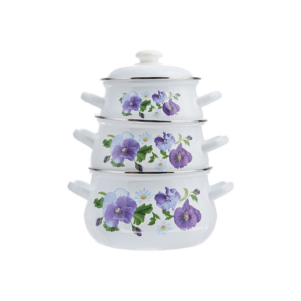 • Дополнительная информация материал крышек: сталь; материал ручек: сталь; грушевидные кастрюли; диаметр/высота стенок/объем: 185x98 мм (2 л), 210x120 мм (3 л), 235x132 мм (4.5 л); двойной слой эмали