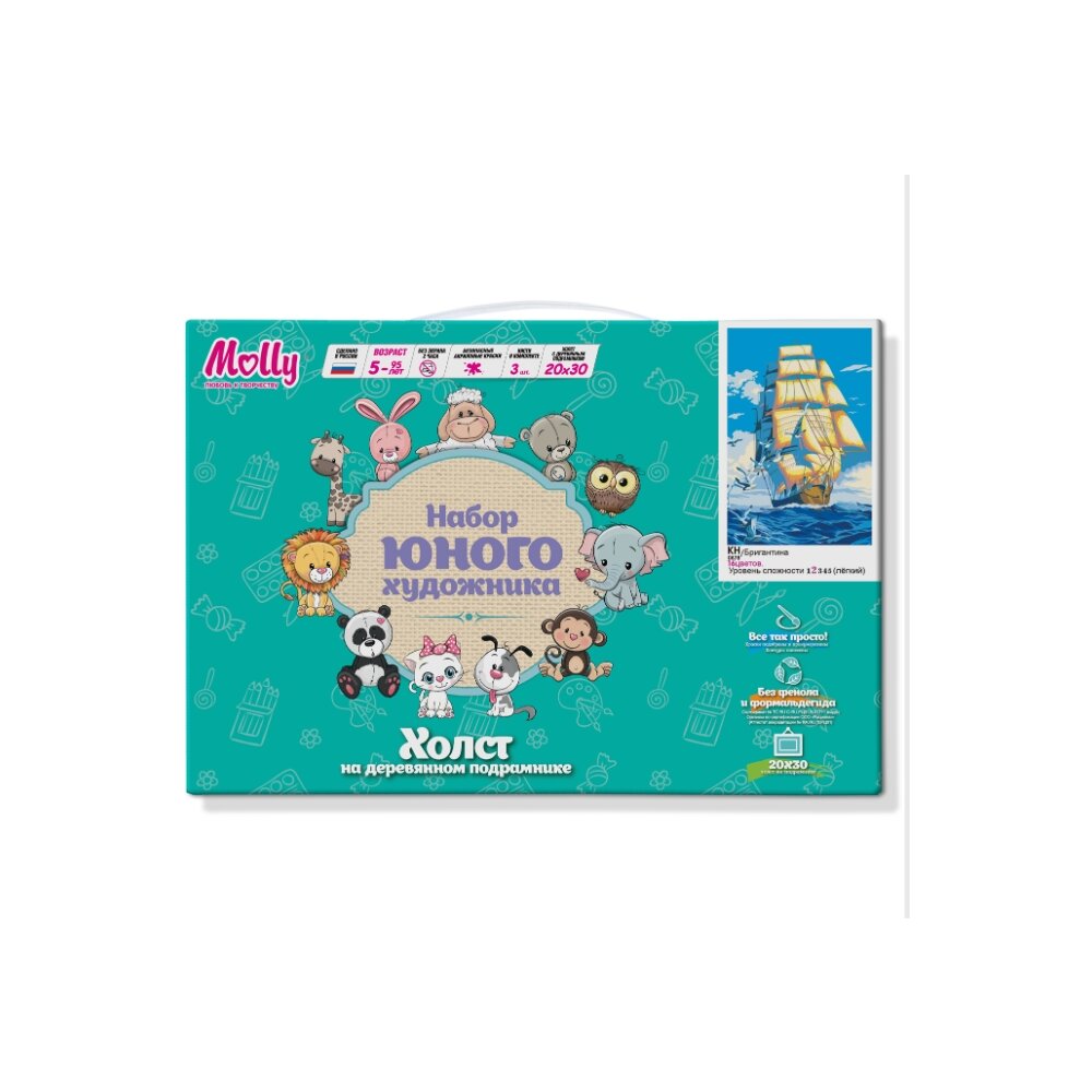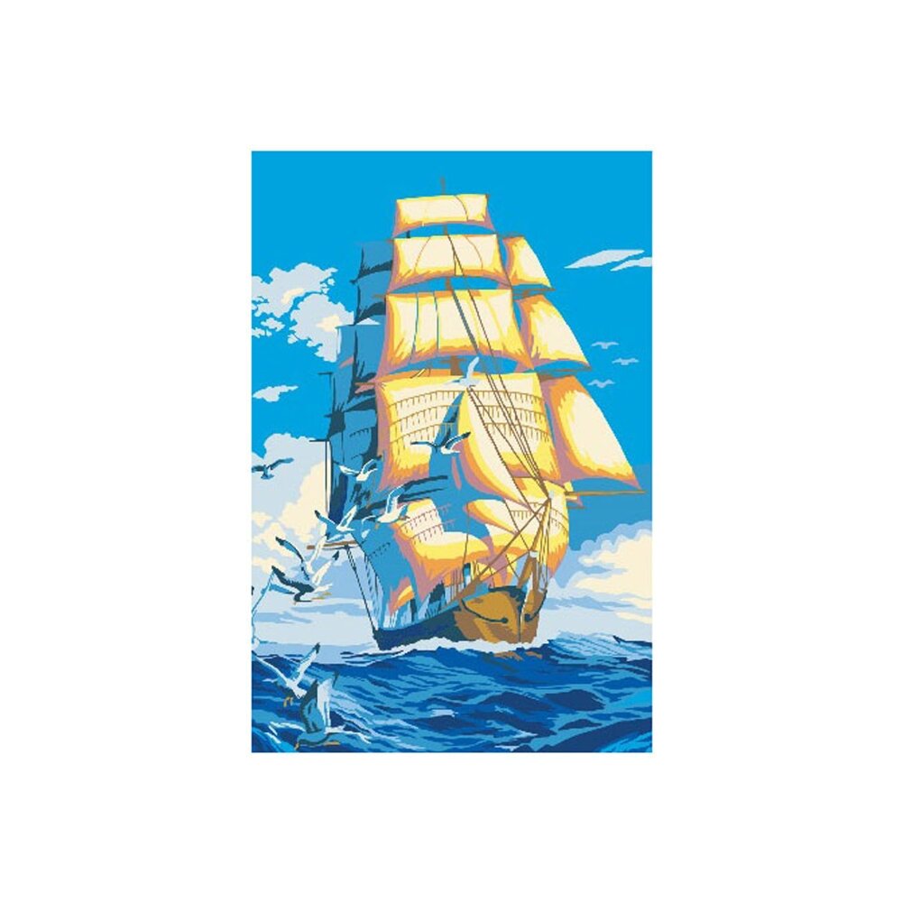 С помощью набора для творчества можно нарисовать Бригантину, мчащуюся по волнам в окружении чаек. Контур изображения разбит на нумерованные сегменты, которые надо закрасить соответствующим цветом. Количество цветов: 16 Уровень сложности: средний Состав набора: холст из натурального хлопка на деревянном подрамнике (холст предварительно прогрунтован), 3 нейлоновые кисти разного размера, профессиональные акриловые краски (устойчивые к выцветанию).