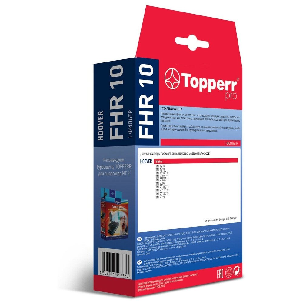 Предмоторный фильтр длительного использования защищают двигатель пылесоса от попадания крупных частиц пыли, задерживает 99% пыли, продлевая срок службы Вашего пылесоса. Данный фильтр подходит для следующих моделей пылесосов HOOVER: Mistral TMI 1215 TMI 1218 TMI 1815 019 TMI 2002 011 TMI 2003 011 TMI 2006 TMI 2015 011 TMI 2017 019 TMI 2018 019 TMI 2019 Тип оригинального фильтра: s112, 35601237 Артикул: FHR 10 Страна производитель: Китай Сертификат: Товар сертифицирован