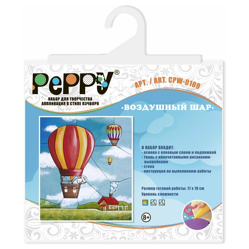 Набор для шитья "PEPPY" CPW-0109 "Воздушный шар" 17x19 см. В набор вложены все необходимые материалы для изготовления готовой картины: ткань с напечатанными рисунками-выкройками, основа с клеевым слоем и подложкой с подставкой для оформления, стека и подробная инструкция. Товар соответствует требованиям ТР ТС "О безопасности игрушек". Набор Аппликация в стиле пэчворк - это увлекательный способ создания картины из ткани. Лоскутки ткани фиксируются на клеевом слое основы, а их края заправляются в прорези на основе при помощи стека. Рекомендуемый возраст - с 8 лет. Развивают мелкую моторику рук и внимательность ребенка. Уровень сложности: 1. Техника: Аппликация