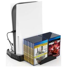 Вертикальная подставка KJH для PS5 - незаменимая вещь для активного пользователя игровых консолей нового поколения. Особенности: - Эффективная система охлаждения: 2 встроенных вентилятора создают систему циркуляции охлаждающего воздуха, которая помогает отводить больше тепла от консоли, предотвращая ее перегрев после продолжительных игровых сеансов. - Универсальная совместимость: подходит для всех консолей Playstation 5 (Стандартной и Digital версии). - Встроенная зарядная станция для 2-х геймпадов DualSense. - 3 USB порта для зарядки геймпадов или других аксессуаров.