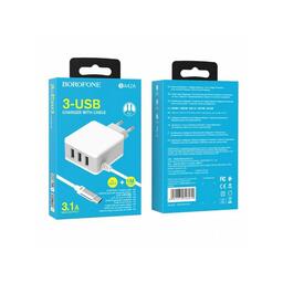 Сетевое зарядное устройство, три USB выхода, ток 3.1A, вилка EU, со встроенным кабелем Type-c