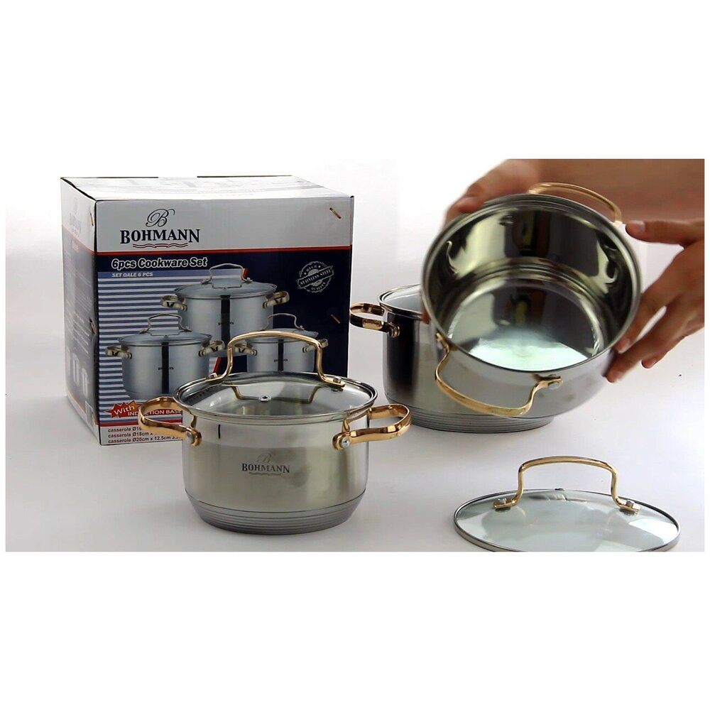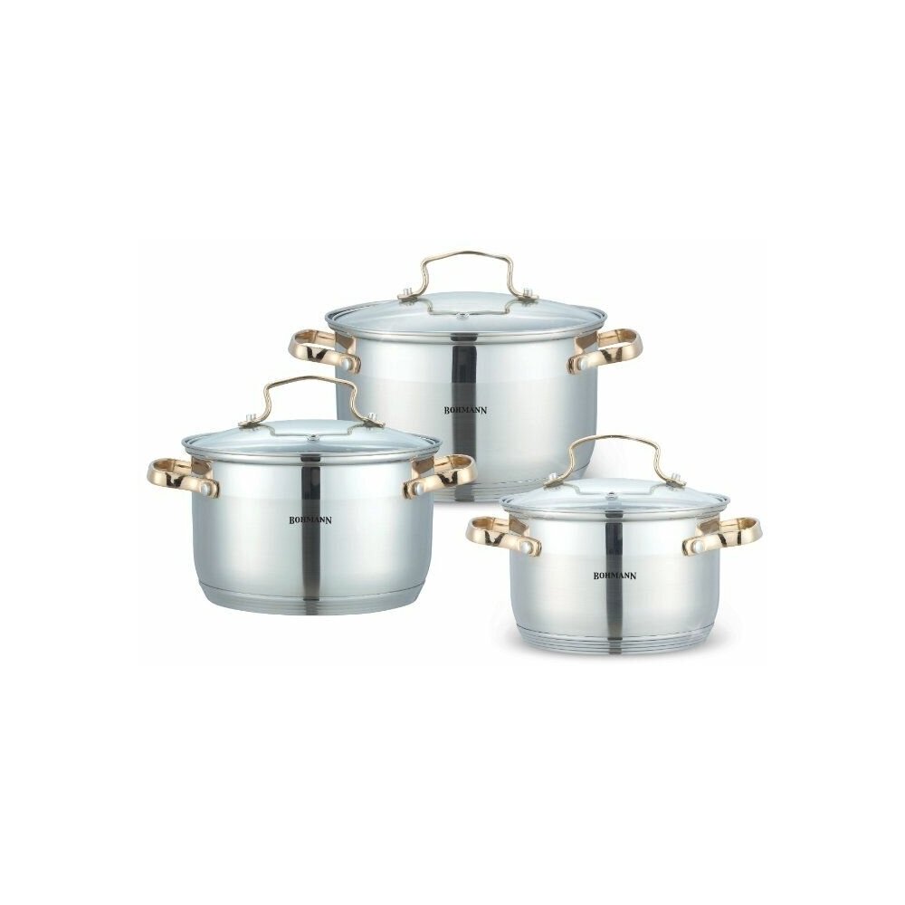 BOHMANN BH 1903 G, Набор кастрюль 6 предметов (объём: 2.1л 2,9л 3,9л стеклянная крышка, ручки под золото)