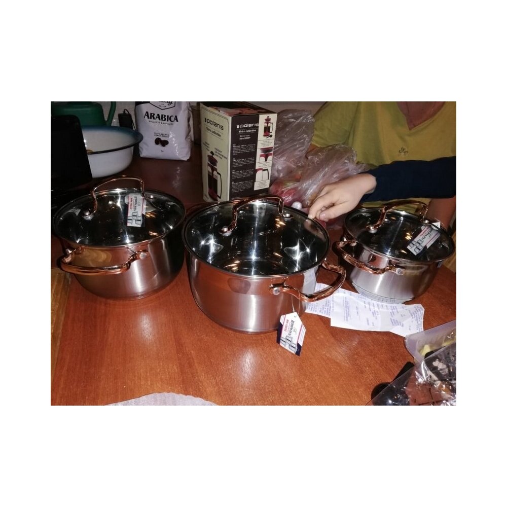 Набор посуды для готовки Bohmann BH-1903 G состоит из 6 предметов:1х кастрюля, объем - 2,1 л, диаметр - 16 см, высота - 10,5 см1х крышка стеклянная, диаметр - 16 см1х кастрюля, объем - 2,9 л, диаметр - 18 см, высота - 11,5 см1х крышка, диаметр - 18 см1х кастрюля, объем - 3,9 л, диаметр - 20 см, высота - 12,5 см1х крышка, диаметр - 20 смКомплект идеально подойдет для жарки и тушения, варки и пассировки. Помимо универсальности, набор посуды Bohmann BH-1903 G обладает массой других достоинств, которые будут оценены даже самой взыскательной хозяйкой.Нержавеющая сталь марки 18/10 не подвергается коррозии, устойчива к царапинам, вмятинам, воздействию агрессивных веществ и пр. Сплав идеален при приготовлении пищи. Он не вступает в реакцию с жирами и кислотами, сохраняет натуральный вкус и запах блюд неизменным.Пятислойное капсульное дно из стали и алюминия обеспечивает равномерное распределение тепла по всей площади посуды.Внутреннее покрытие не изменяет вкус и запах пищи, препятствует ее пригоранию; оно не содержит PFOA и позволяет готовить с меньшим количеством масла/жира. Это делает готовое блюдо менее калорийным.Посуда из нержавеющей стали легко очищается от остатков пищи при помощи обычного моющего средства и губки. Можно мыть в посудомоечной машине.Стальные ручки под золото надежно закреплены на корпусе заклепками; они удобно лежат в ладонях и не скользят.Крышки из жаропрочного стекла с отверстиями для отвода пара и стальным ободом; они обеспечат оптимальный температурный режим при приготовлении блюд.Возможность использования кастрюль на любых варочных поверхностях, в том числе индукционных.Стильный дизайн — серебристая расцветка в сочетании с комбинированным покрытием прекрасно впишется в любой современный интерьер.Можно использовать в духовом шкафу.Характеристики:Состав дна предметов набора посуды - пятиступенчатое капсульное дно, нержавеющая сталь, алюминий Состав ручек набора посуды - сталь под золото Способ крепления - клепочное Термостойкая стеклянная крышка Состав - стекло, нержавеющая сталь Набор кастрюль Bohmann (Бохманн) BH - 1903 G подходит для электрической, стеклокерамической, газовой, галогеновой, индукционной плиты. Набор посуды можно мыть в посудомоечной машине.Вес за штуку (кг.): 3. 98 Обьем за штуку (м3.): 0. 0143Размеры штука (см.): 26х22х24,5Набор посуды 6 предметов Стальные ручки (под золото), клепанные. Стеклянные крышки. Кастрюли: 16х10,5см -2.1л; 18х11,5см-2,9л; 20 x 12,5 - 3,9л. Подходит для индукции.