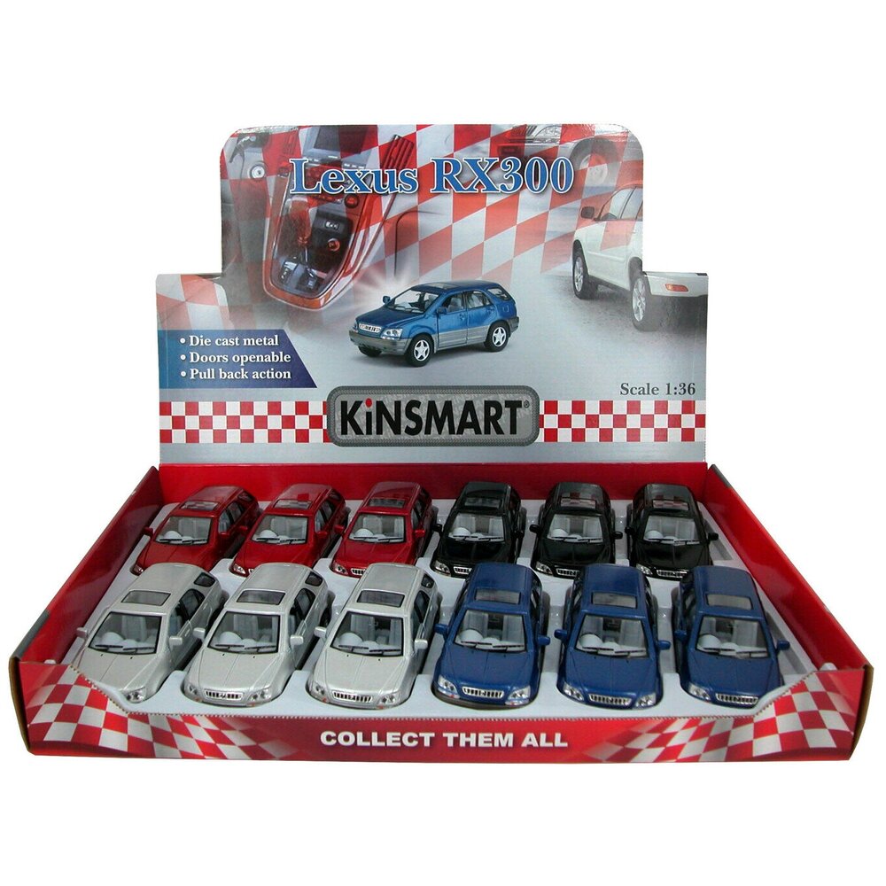 Коллекционная модель кроссовера Lexus RX300 от Kinsmart снабжена инерционным механизмом. У автомобиля открываются передние двери. Масштаб - 1/36. Внимание! Товар представлен в цветовом ассортименте: красный, синий, серебристый, черный. При заказе указывайте желаемый цвет в комментарии. Цена указана за одну модель.