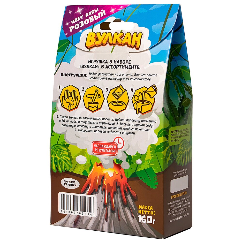 С набором для опытов Вулкан у тебя появится отличная возможность стать свидетелем впечатляющего зрелища с мерцающим извержением. Ты самостоятельно можешь провести эксперимент у себя дома, используя компоненты из набора. В линейке Вулкан 3 цвета песка: синий, красный, классический песочный и 6 цветов пигментов: фиолетовый, черный, зеленый, розовый, голубой, желтый. Яркое извержение лавы с блестками вызовет восторг у детей и их родителей, подарит положительные эмоции и веселое настроение. Создать свой Вулкан очень просто:слепи вулкан из космического песка;добавь 1/2 пакетика пигмента в 50 мл воды;тщательно перемешай;насыпь в вулкан пищевую соду, лимонную кислоту и глиттеры (по половине каждого пакетика);аккуратно налей цветную жидкость в вулкан.